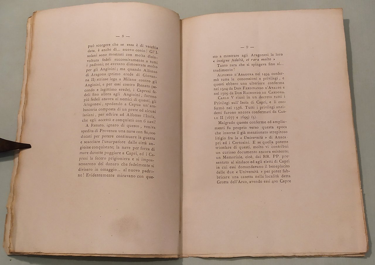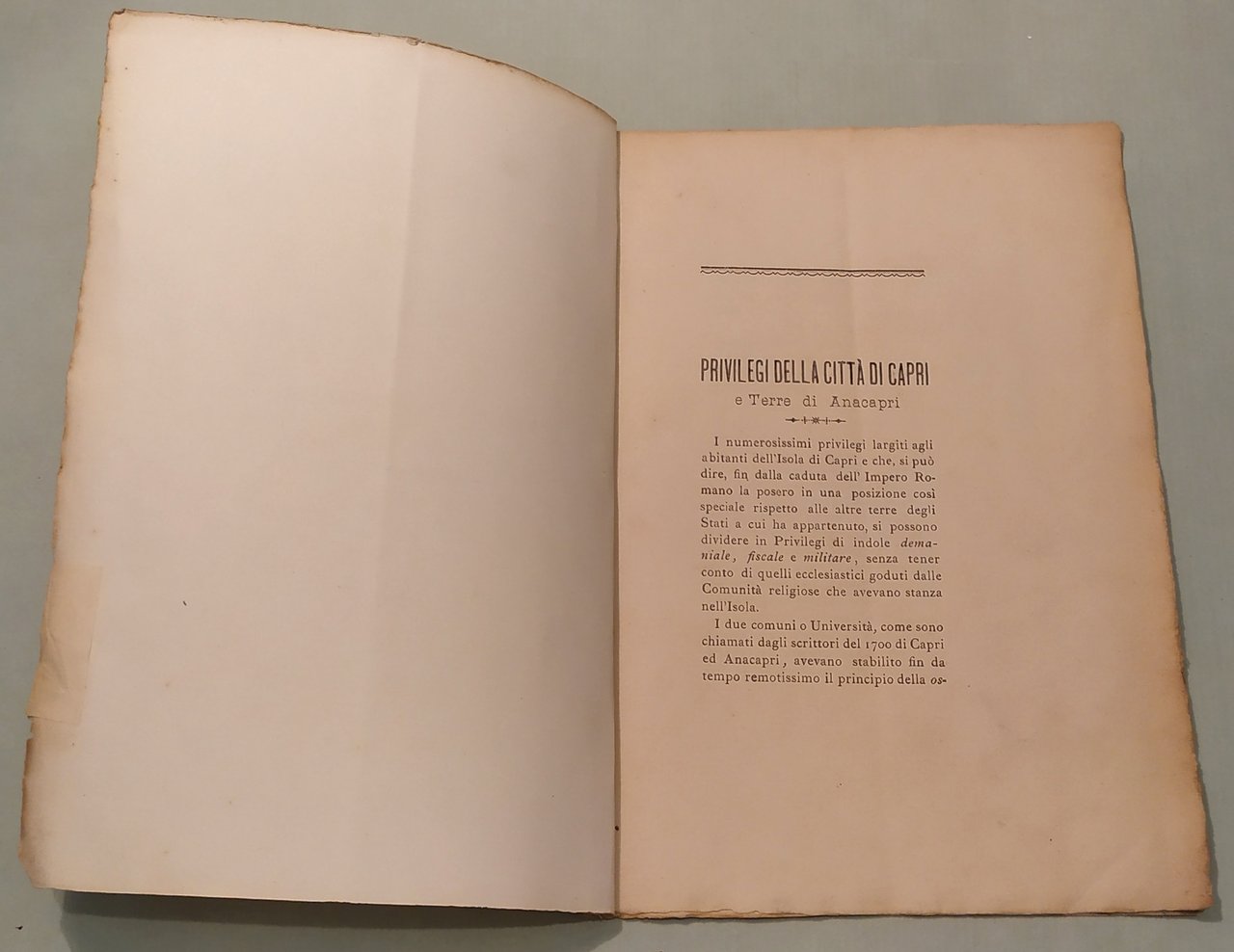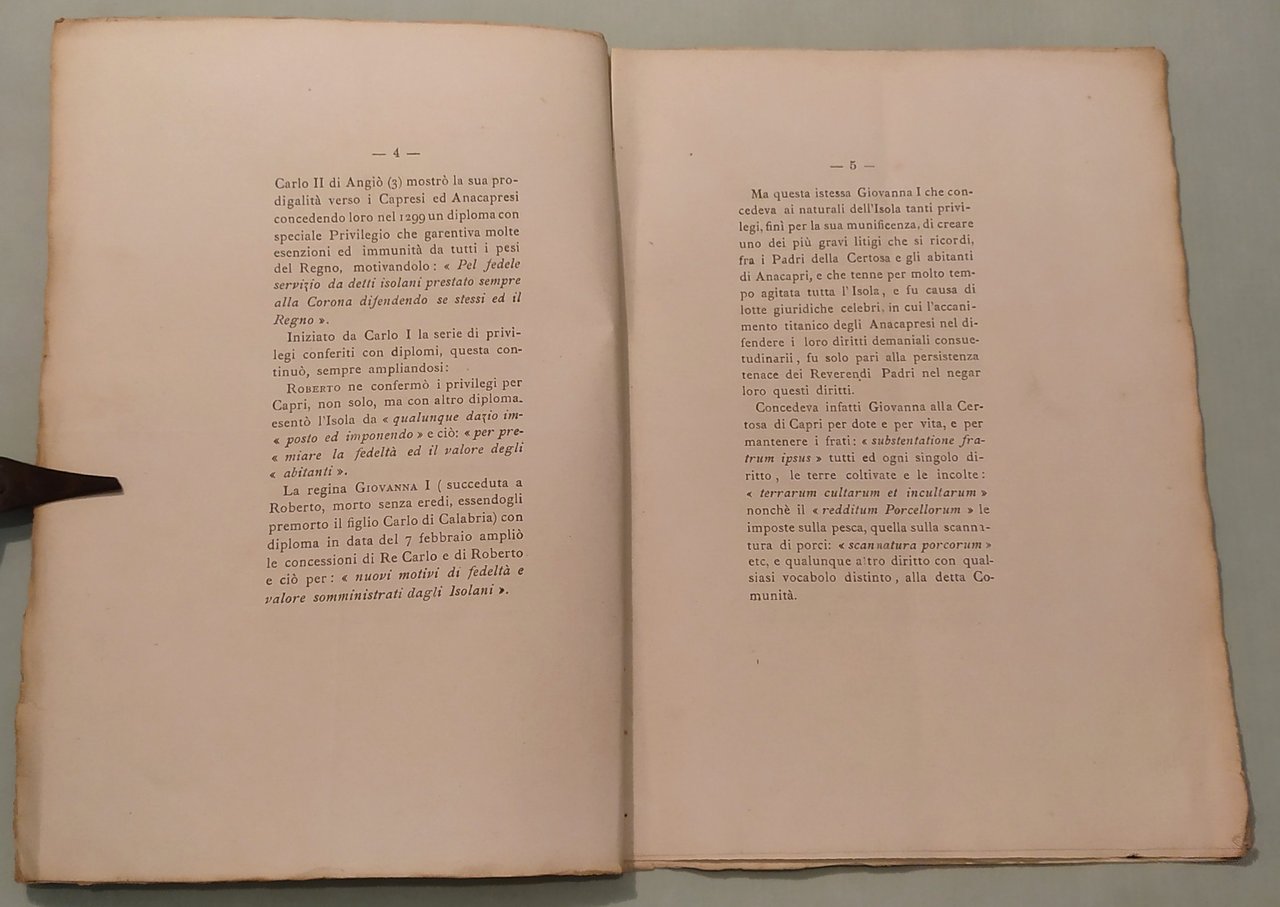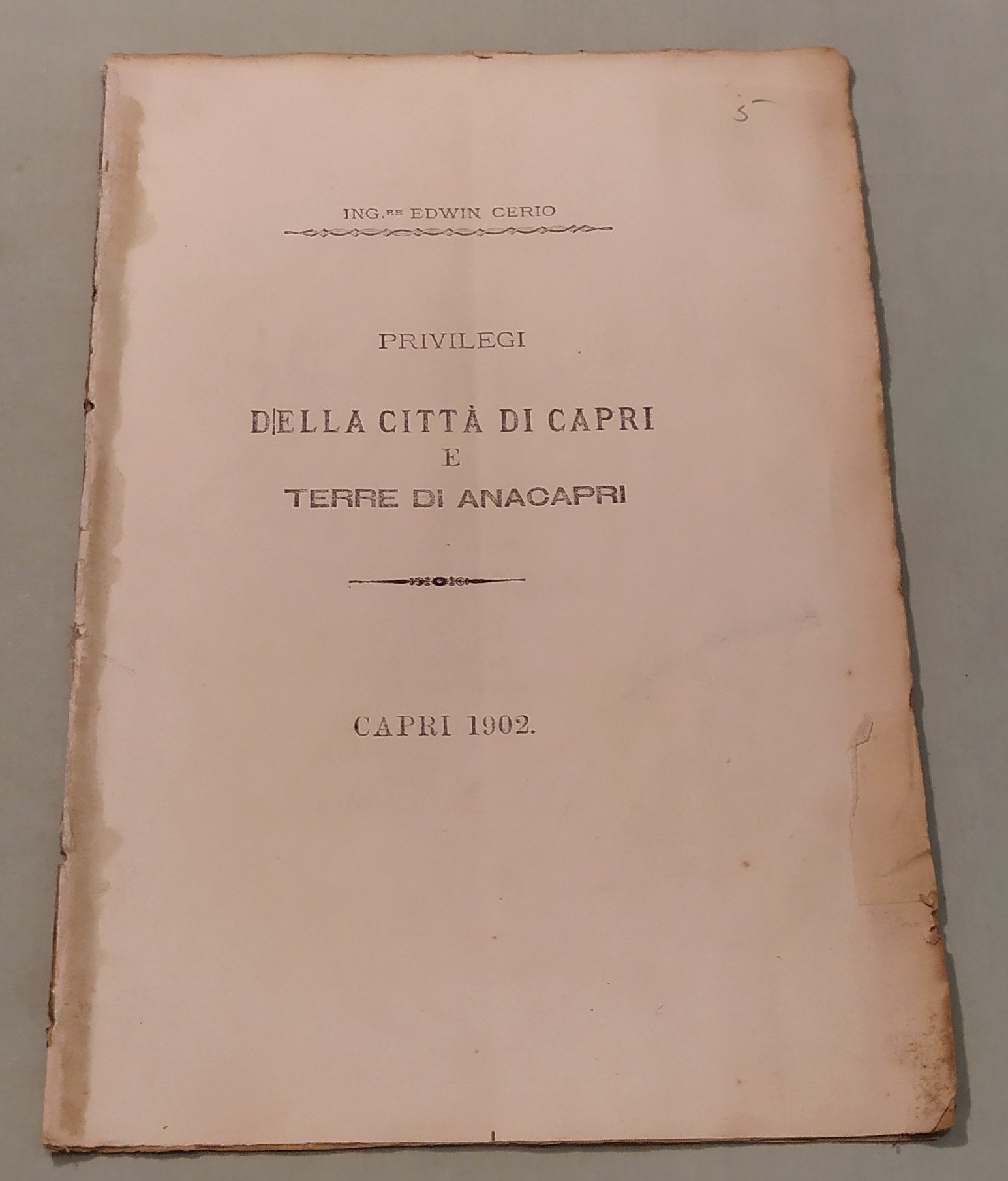 CERIO Edwin. Privilegi della Città di Capri e terre di Anacapri. Capri, 1902. In 8vo; pp.16. Privo di legatura. Edizione non venale stampata in pochi esemplari su carta a mano con ampi margini. Appassionata ricerca di tutti i titoli che hanno privilegiato l’isola di Capri sin dalla controversa donazione ai Frati di Montecassino confermata da Giustiniano. Doria, 374; Furcheim, pag.28.