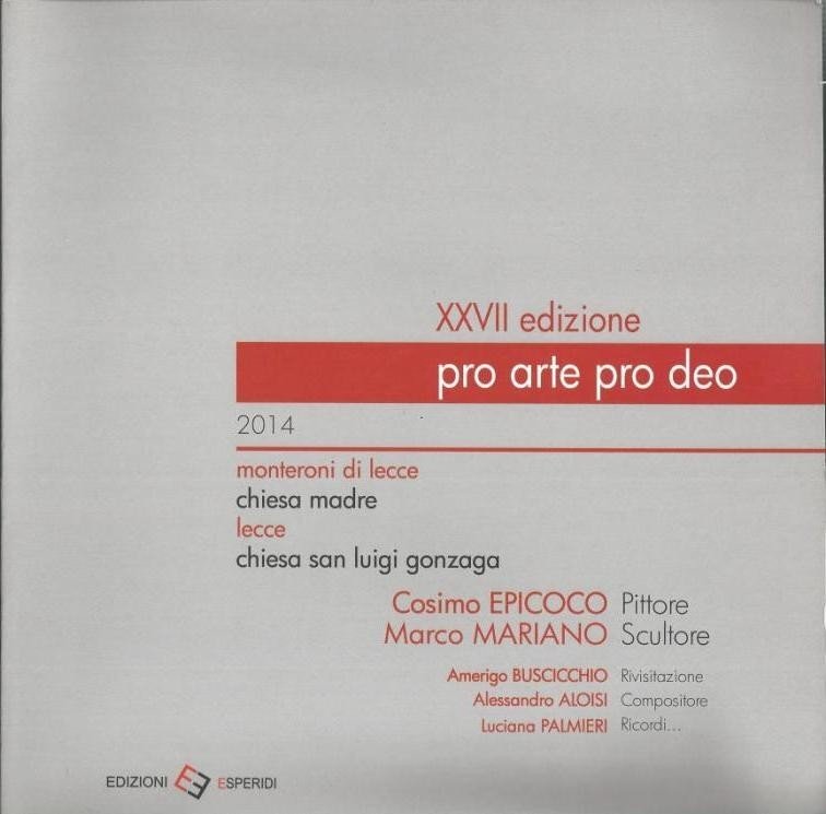 Pro arte pro deo. XXVII edizione 2014, a cura di Massimilano Cesari e Daniela Rucco, introduzione di Lucio Galante, Edizioni Esperidi, Monteroni di Lecce (Lecce) 2014, pp. 59, ill. col., cm 22x22, br. ed. Titolo alla prima di copertina: Pro arte pro deo. XXVII edizione 2014. Monteroni di Lecce, Chiesa Madre – Lecce, Chiesa San Luigi Gonzaga, Cosimo Epicoco pittore, Marco Marinao scultore, Amerigo Buscicchio rivisitazione, Alessandra Aloisi compositore, Luciana Palmieri ricordi… Indice: Presentazioni di Domenico Umberto D’ambrosio, Lino Guido, Adolfo Putignano, Chiara Marini, Giuseppe Turino, Maurizio Celi – Lucio Galante, Presentazione – Massimiliano Cesari, Cosimo Epicoco e l’identificazione del sacro – Daniela Rucco, Arte e sacralità nelle creazioni scultoree di Marco Mariano – Giuseppe Mancarella, Amerigo Buscicchio e la chiesa del Crocefisso seu la Candelora – Luciana Palmieri, Ricordi… - Storia della Rassegna di Arte Sacra Pro Arte Pro Deo. In catalogo opere di: Cosimo Epicoco, Marco Mariano e Amerigo Buscicchio. Leggere tracce d’uso, per il resto perfetto.