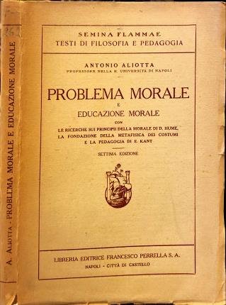 Con le ricerche sui principi della morale di Hume La fondazione della metafisica dei costumi e la pedagogia di E. Kant. Settima edizione. In 8° (cm 21,3 x 14,7), pp. 275. Bross. Tit. marrone al dorso brunito. Segni di consunzione, strappetti ai margini e alle cuffie. Tagli e pagine bruniti. Tracce di polvere. Firma, ex-libris e scritta al frontespizio. Firma alla prima pagina. Pagine intonse. Discrete condizioni.