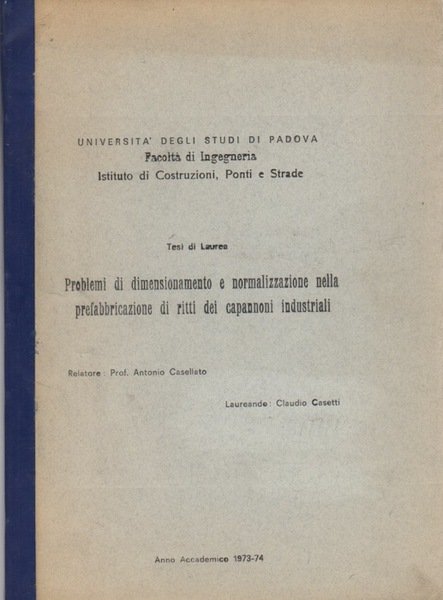 45 p., [4] c. di tav., [70] c. di tav. ripieg., [1] c. di tav. Condizioni : USATO - Stato : Buono, ordinari segni d'uso e del tempo. Altre note : Tesi di laurea della facoltà di Ingegnaria, discussa nell'anno accademico 1973-1974, relatore Prof. Antonio Casellato. In apposita tasca a fine volume ulteriore carta ripieg. con programma per il calcolo dei momenti di rottura per travi c.a.p.