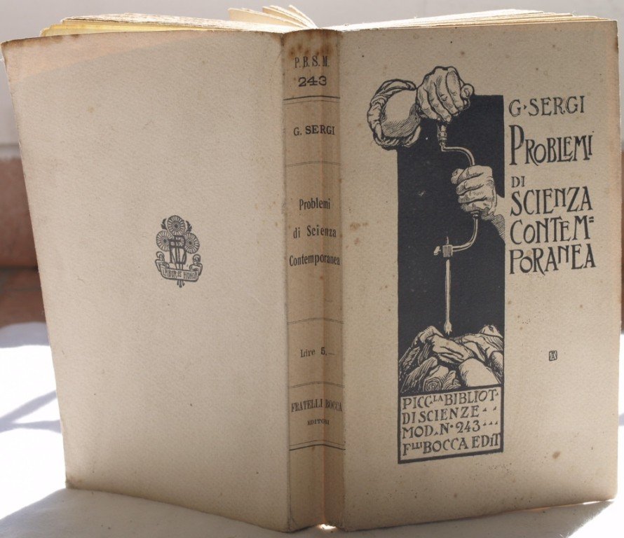 In 8. Dim. 21x13 cm. Pp. X+2 (n.n.)+320. Seconda serie del 1916 di questa raccolta di scritti scientifici e paleantropologici del Sergi (1841-1936), paleontologo e antropologo positivista fecondissimo, autore di oltre 400 pubblicazioni e fondatore della società romana di antropologia. In quest'opera scientifica contributi per le analisi morfologiche, variazioni ed evoluizone, paleantropologia, teorie di Mendel, eugenica ed eredità biologica, i sentimenti nell'attività umana. Bella brossura editoriale illustrata. In ottime condizioni. Brossura editoriale in ottime condizioni generali con lievi usure ai margini e dorso. rare fioriture. Second series of 1916 of this collection of scientific and paleanthropological writings by Sergi (1841-1936), positivist paleontologist and anthropologist who wrote a lot of books, author of more than 400 writings who established the roman society of anthropology. In this scientific work contributes to morphological analysis, variations and evolution, paleanthropology, theories of Mendel, eugenics and biologic heredities, the feelings in human activities. Beautiful illustrated decorated cover. In very good conditions. Editorial cover in very good general conditions slightly worn in the edges and spine. Binding in good conditions. Inside pages are in very good conditions with occasional foxings.