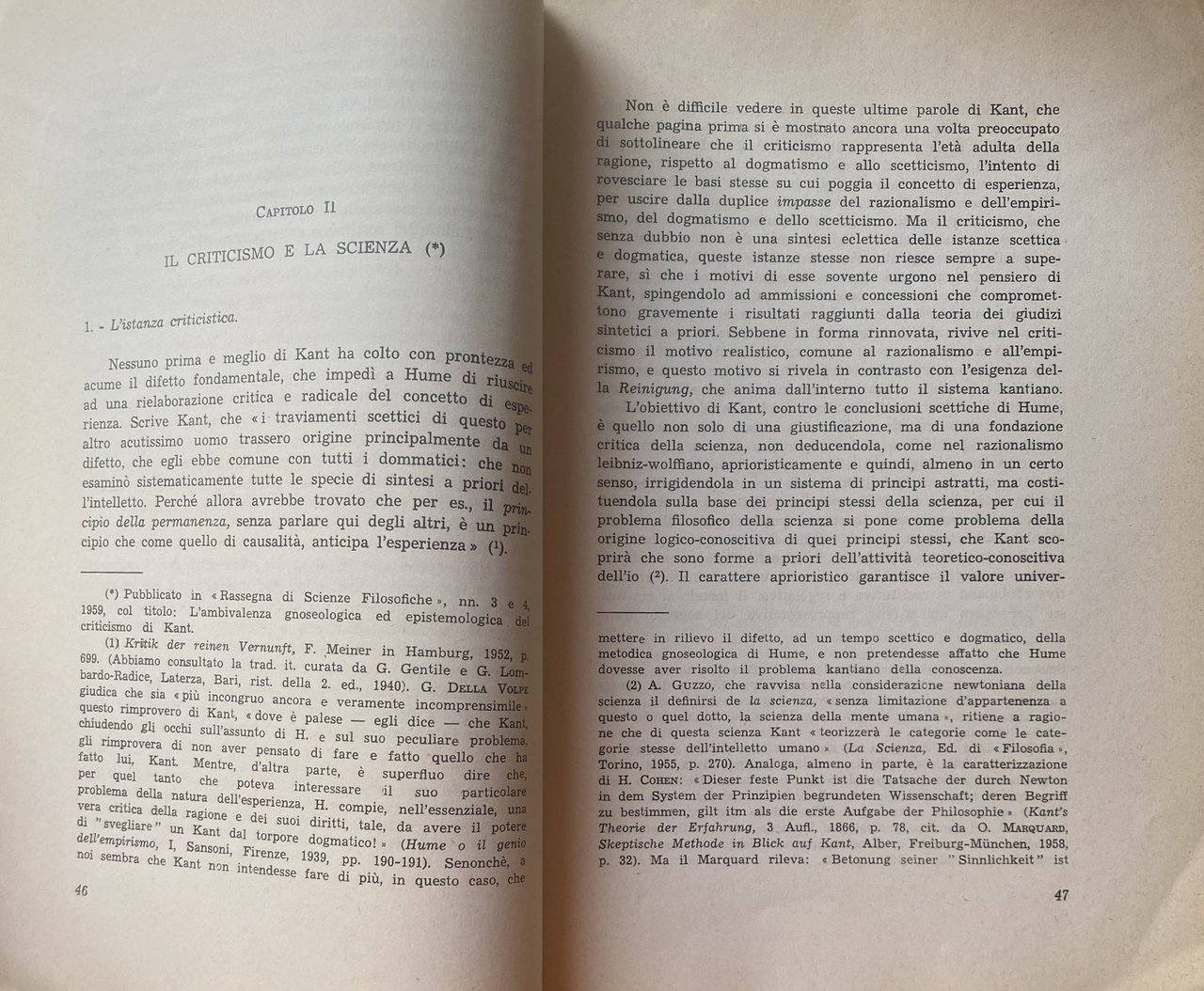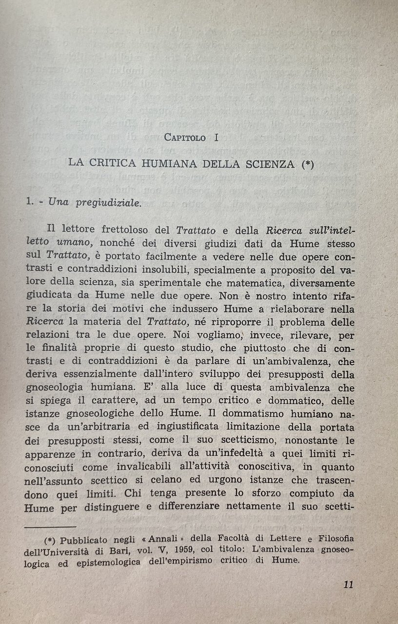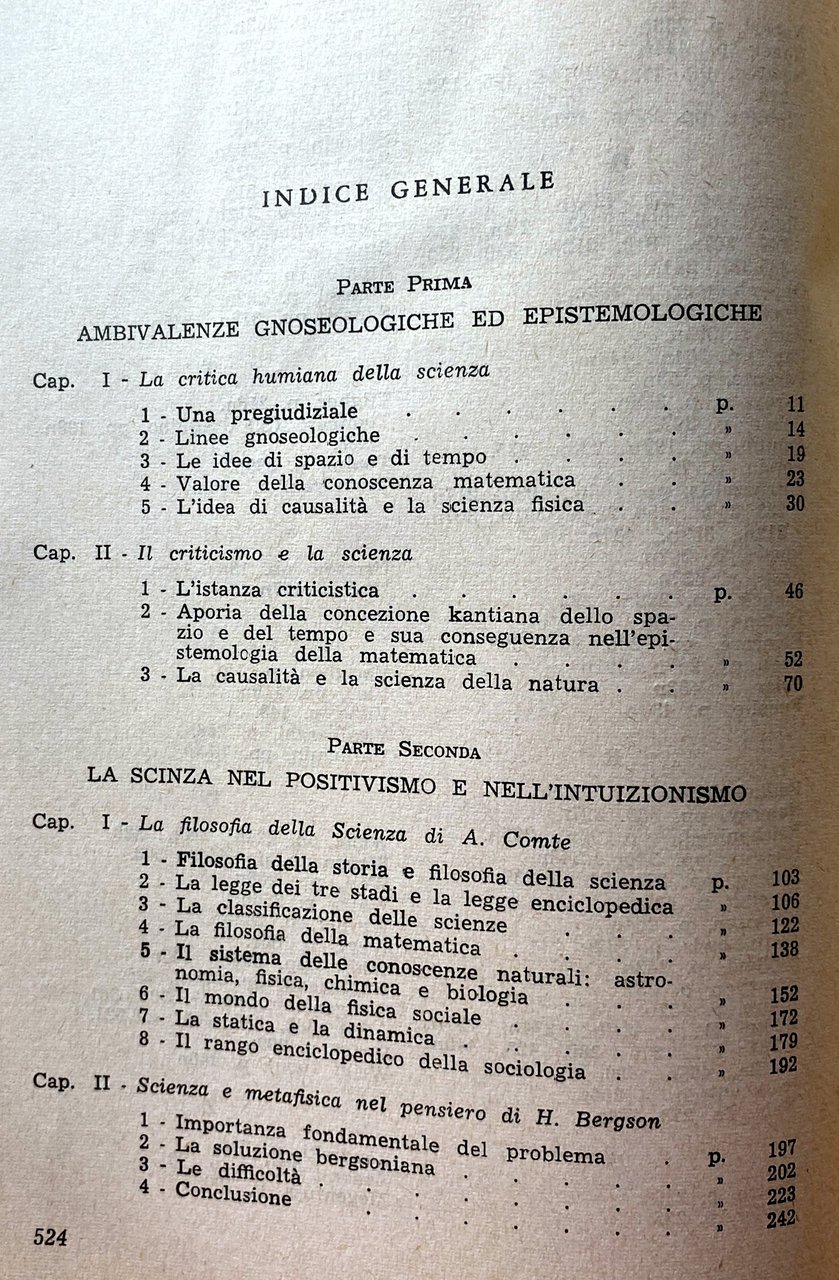 AVVERTENZA. I saggi, che abbiamo curati nella forma e bibliograficamente aggiornati, non seguono l'ordine cronologico della prima pubblicazione, né le Parti, in cui sono raggruppati, ubbidiscono sempre al criterio dello sviluppo storico-teoretico del problema. La Parte Prima sviluppa l'idea di un'ambivalenza, che ci è sembrato di ravvisare, quantunque con caratteri diversi e con diverso significato, sia in Hume che in Kant. La Parte Seconda mostra, in un certo senso esemplarmente, il superamento dell'epistemologia positivistica, nella formulazione comtiana, con la tipica prospettiva di Bergson, che pure proveniva dal positivismo. La Parte Terza mostra il diverso modo di intendere il fondamento della scienza in Dewey e in Husserl. Il saggio su Husserl è il più antico e non ho voluto modificarne la struttura, che mi sembra ancora valida, entro i limiti del tema, anche dopo gli studi che sto conducendo sul pensiero di Husserl in una tematica ben più vasta. L'analogia, che più di un autore vuol vedere nella funzione del pensiero di Husserl e di Dewey, è talmente generica, che non tarda a rivelarsi inconsistente nella considerazione della concezione radicalmente diversa, che Husserl e Dewey hanno dei fondamenti della scienza. La Parte Quarta, infine, raccoglie il lungo saggio sulla Sintassi di Carnap e i due saggi sulle due ultime opere postume di Wittgenstein, mettendo in risalto il contrasto dell'analisi logica del linguaggio nelle due direzioni della sintassi del linguaggio scientifico, che è uno sviluppo delle istanze del Tractatus, e della semantica del linguaggio ordinario, che caratterizza il filosofare dell'ultimo Wittgenstein.