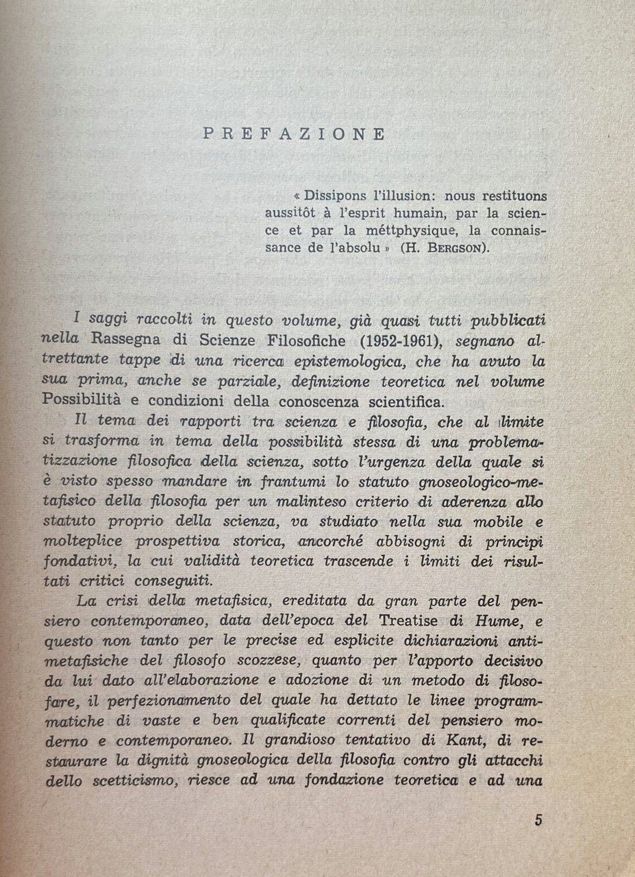 I saggi raccolti in questo volume, già quasi tutti pubblicati nella Rassegna di Scienze Filosofiche (1952-1961), segnano altrettante tappe di una ricerca epistemologica, che ha avuto la sua prima, anche se parziale, definizione teoretica nel volume Possibilità e condizioni della conoscenza scientifica. Il tema dei rapporti tra scienza e filosofia, che al limite si trasforma in tema della possibilità stessa di una problematizzazione filosofica della scienza, sotto l'urgenza della quale si è visto spesso mandare in frantumi lo statuto gnoseologico-metafisico della filosofia per un malinteso criterio di aderenza allo statuto proprio della scienza, va studiato nella sua mobile e molteplice prospettiva storica, ancorché abbisogni di principi fondativi, la cui validità teoretica trascende i limiti dei risultati critici conseguiti. La crisi della metafisica, ereditata da gran parte del pensiero contemporaneo, data dell'epoca del Treatise di Hume, e questo non tanto per le precise ed esplicite dichiarazioni anti-metafisiche del filosofo scozzese, quanto per l'apporto decisivo da lui dato all'elaborazione e adozione di un metodo di filosofare, il perfezionamento del quale ha dettato le linee programmatiche di vaste e ben qualificate correnti del pensiero moderno e contemporaneo. Il grandioso tentativo di Kant, di restaurare la dignità gnoseologica della filosofia contro gli attacchi dello scetticismo, riesce ad una fondazione teoretica e ad una valorizzazione critica dei principi della scienza, ma per quanto riguarda il problema della possibilità della metafisica, subisce le suggestioni delle conclusioni del pensiero di Hume, appena appena attenuate in un'incerta prospettiva di agnosticismo. Era una rivincita dell'empirismo, a dispetto dei successi del criticismo e della riabilitazione dell'apriori: quella rivincita sorresse le speranze teoretiche del positivismo, come sorregge quelle del neo-positivismo, e, d'altra parte, ha segnato il limite acritico dei sistemi aprioristici, la naturale compensazione teoretica dei privilegi dell'apriori, disancorato dalla problematica metafisica, in cui esso invece si colloca spontaneamente. Il problema filosofico della scienza ha seguito, ovviamente, questa vicenda speculativa, che si è arricchita e complicata per l'intrecciarsi con motivi speculativi di altra e diversa provenienza culturale, per maniera che non è possibile riproporre il problema, senza aver preso coscienza delle istanze così diverse e contrastanti, che lo sorreggono. È un modo, questo, di prendere coscienza del problema stesso. I saggi qui raccolti, non hanno lo scopo di esaurire la vasta panoramica, che si offre allo sguarda dello studioso, ma di mettere in luce alcuni punti di maggior rilievo di essa. Quasi tutti hanno, poi, esplicita o implicita, una conclusione critico-teoretica in cui si esprime il processo di consapevolizzazione del problema e lo sforzo di un orientamento personale nella soluzione di esso. Questo spiega, perché la presente raccolta non termina con una Conclusione su tutta la materia dei saggi, che oltre ad appesantire il volume, sarebbe stata inevitabilmente soggetta a inutili ripetizioni.
