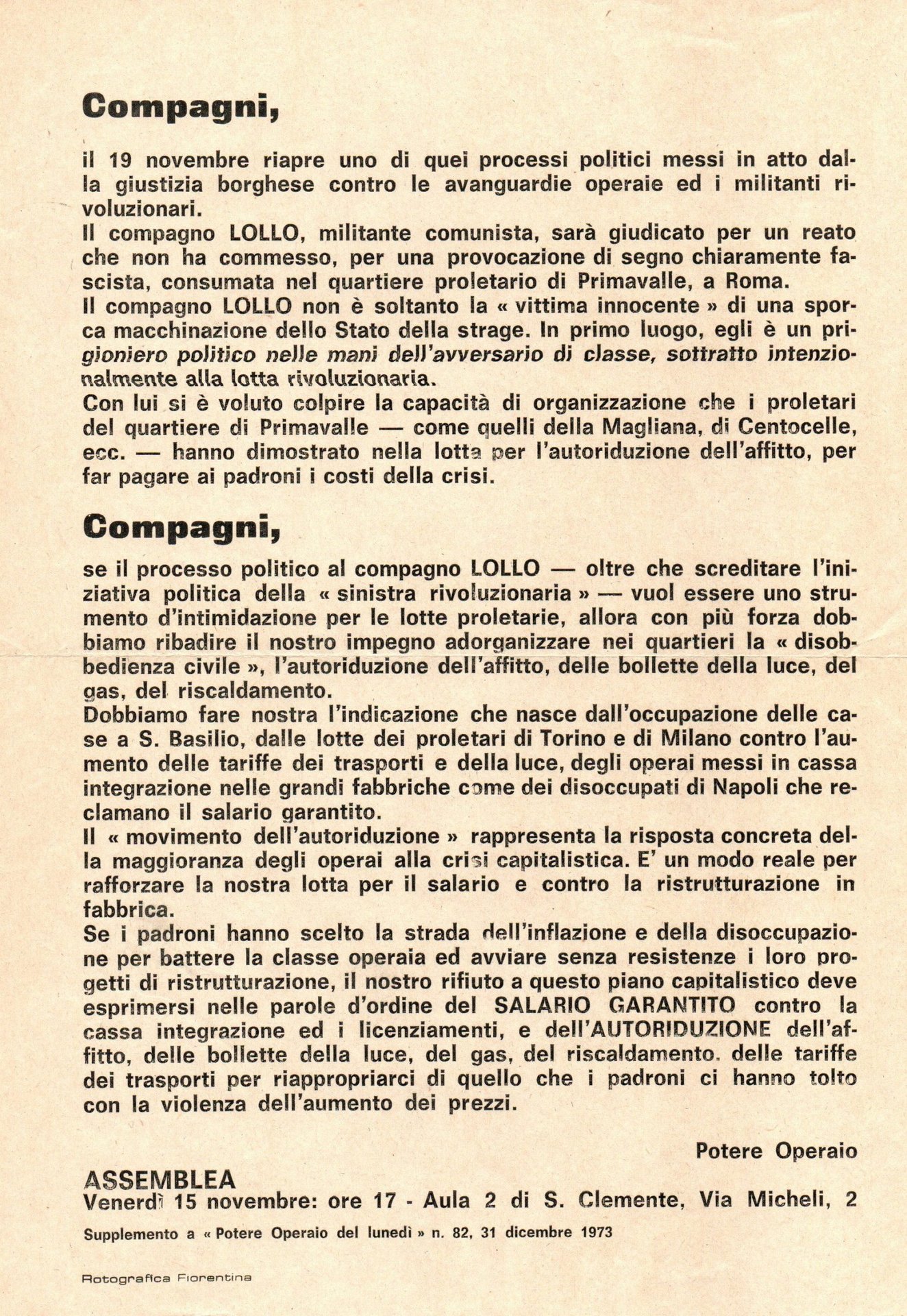 Volantino in difesa di Achille Lollo accusato della strage di Primavalle. Stampato al recto.