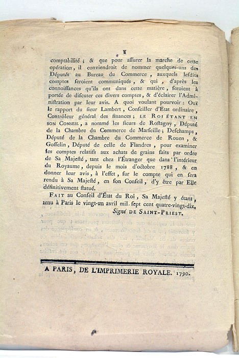 PROCLAMATION du Roi, portant nomination de trois Députés de la Chambre du Commerce, pour l'examen des comptes des Grains et Farines achetés et vendus par ordre du gouvernement.
