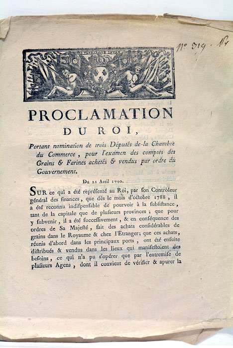 2 pages. (1 feuillet blanc). (27x22 Cm). Broché. Proclamation du Roi au sujet du commerce des grains et farines.