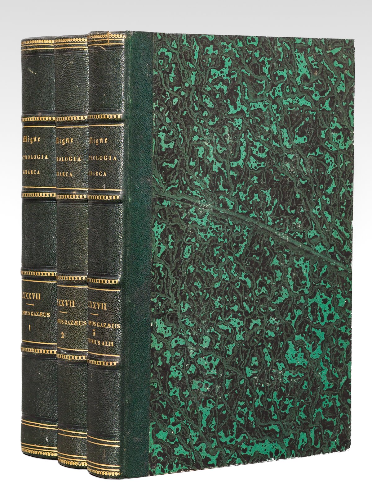Accurante J.P. Migne, 3 vol. in-4 reliure de l'époque demi-chagrin vert, dos à 4 nerfs dorés, Apud J.P. Migne, Petit-Montrouge, 1860. Rappel du titre complet : Procopi Gazaei, Christiani rhetoris et hermeneutae, Opera quae reperirir potuerunt omnia, accedunt S. Sophroni Hierosolymitani, Joannis Moschi, Alexandri Monachi scripta vel scriptorum fragmenta quae supersunt (1 Tome en 3 volumes - Complet). Patrologiae Cursus completus. Series Graeca. Tomus LXXXVI Prima, Secunda, Tertia [ Patrologia Graeca Tome 87 en trois volumes - Procope de Gaza, Jean Moschus, Sophrone de Jérusalem, Alexandre le Moine ] Rare exemplaire en bon état, bien relié et bien complet du tome 87 (en 3 volumes) de la Patrologie grecque de Migne, bien complet des oeuvres de Procope de Gaza, Jean Moschus, Sophrone de Jérusalem, Alexandre le Moine. Avec le texte grec et la traduction latine en regard (coupes très lég. frottées, ancien cachet de monastère, rares rouss., très bon état par ailleurs). Peu commun, surtout en si bon état. Rare copy in good condition, well bound and very complete with volumes 79 of Migne's Greek Patrology, containing the works of Procopius of Gaza, John Moschus (Spiritual Meadow), Sophronius, Alexander monk. With the Greek text and the Latin translation opposite.