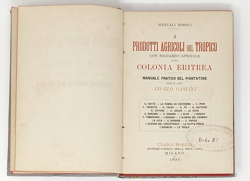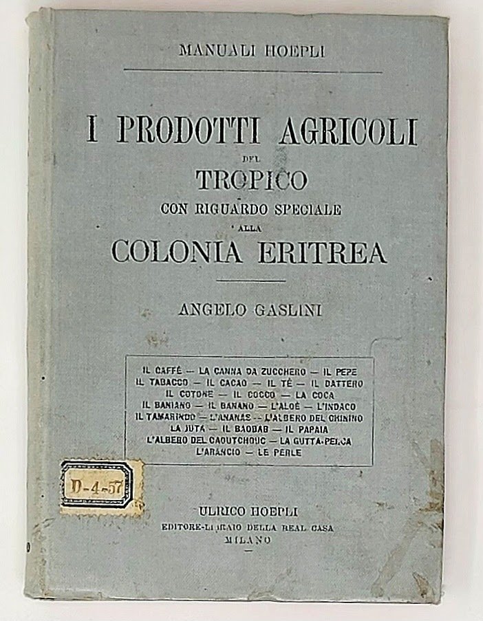 >in-8, pp. XV, (1), 270, 32 (con l'''elenco dei manuali hoepli publicati sino al 1895'') legatura in tela editoriale, tagli rossi. Edizione originale di questo interessante manualetto sulla coltivazione coloniale di caffè, canna da zucchero, pepe, tabacco, cacao, the, dattero, coca, banano e baniano, ananas e molti altri. Buon esemplare (timbro di biblioteca estinta al frontespizio).