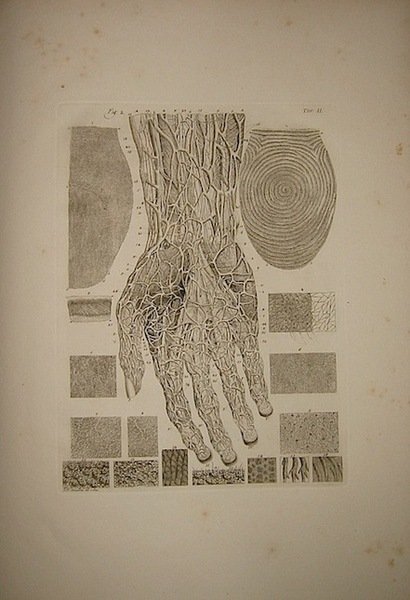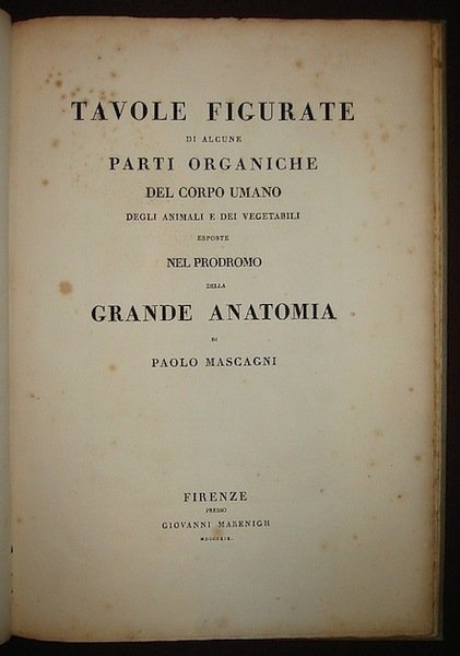 Folio (cm. 46,2 e cm. 54), 2 Voll. (di cui il primo di testo e l’altro dal titolo ‘Tavole figurate di alcune parti organiche del corpo umano degli animali e dei vegetabili esposte nel Prodromo della grande anatomia’), 7 cc.nn., 194 pp., 1 c.nn., CII pp., 1 c.nn.; 1 c.nn. e 20 tavv. Legature coeve in mz. pergamena con titolo su tassello cartaceo al ds. (piccola mancanza nella parte inferiore del ds. del volume di testo). Ex libris di collezione privata al contropiatto. Forellini e brevi percorsi di tarlo marginali che interessano in pochi casi alcune tavole. Qualche leggera fioritura. Nel complesso buon esemplare. Rara edizione originale non presente in Garrison-Morton e in Walleriana. Paolo Mascagni (1755-1815), considerato uno dei più grandi anatomisti italiani, si laureò ed insegnò nelle Università di Firenze, Pisa e Siena dove divenne anche presidente (1798) dell’Accademia dei Fisiocritici. I suoi studi sul sistema dei vasi linfatici lo resero celebre in tutta Europa.