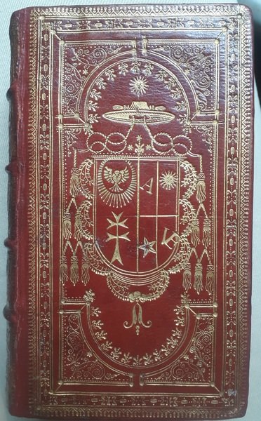 In-12°, (24cc), 560pp, (4cc), occhietto, fregi e iniziali xilografiche, bellissima legatura in marocchino rosso alle armi dell’Arcivescovo di Tarso Francesco Maria Febei su entrambi i piatti, titolo in oro al dorso, fregi, nervature, tagli in oro. Esemplare di dedica allo stesso Arcivescovo Febei.Si tratta dell’opera più famosa del giurista umbro Antonstefano Cartari.In-12°, (24cc), 560pp, (4cc), half-title, wooden engraved ornaments and tail ornaments, splendid red morocco binding, gilt coat of arms of Archbishop of Tarsus Francesco Maria Febei on both sides, gilt title at the spine, ornaments, bands, gilt edges. It is the most known work of Umbrian jurist Antonstefano Cartari. Dedication copy to the same Archbishop Febei.
