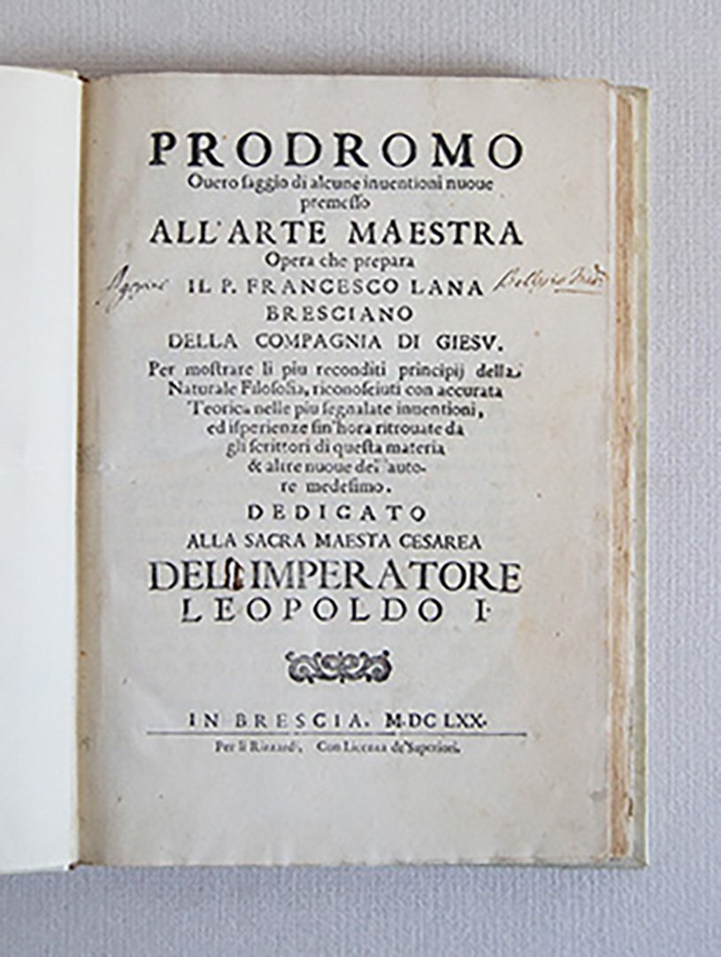 Lana (1631-1687), gesuita e collega di Kircher, fu professore di fisica a Brescia. In questa opera fornisce un'ampia descrizione di invenzioni nei più svariati campi delle arti e delle scienze. Tra le altre troviamo: microscopi, igrometri, orologi, pompe idrauliche, un nuovo tipo di termometro, un metodo di scrittura cifrata, un sistema per insegnare a scrivere ai ciechi, un metodo per produrre colori, etc. Della massima importanza, la famosa descrizione di una macchina volante che Dibner definisce: "the earliest presentation of the concept of flight based on aerostatic principles."