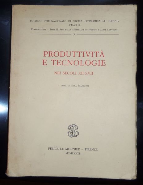 [Economia Storia](cm. 29) Brossura editoriale, -pp.511 + 16 tavole f.t.con immagini; tanti diagrammi e tabelle nel testo. Il volume raccoglie gli interventi delle terza settimana di Studio a cura dell'istituto internazionale di Storia economica " Datini" di Prato. Gli interventi, sono raccolti i base al macrotema di ogni giornata: Produttivit‡ e tecnologie, Rendimenti agricoli, Produttivit‡ e sfruttamento delle fonti di energia, Produttivit‡ e tecnologia delle manifatture tessili, Produttivit‡ e tecnologia nell'attivit‡ mineraria e metallurgia, Tecniche d'affari e produttivit‡ nella pratica e negli scritti del tempo. Gli interventi sono stati pubblicitati cosÏ come presentati al convegno, quindi senza traduzioni, oltre ai saggi in italiano, alcuni saggi sono in lingua francese, inglese e tedesca. usuali lievi segni del tempo alla brossira, qualche macchietta al dorso della stessa, altrimenti ottimo e nitido l'interno, nel quale si segnala solo un timbro "saggio" alla prima pagina bianca. [n48]