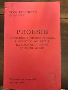 [vt] Poesie in dialetto veneto dell'autore di Nove, Vicenza. Con lunga dedica manoscritta autografa. Piccolo strappo all'angolo sup. sx del piatto e dorso e gora all'angolo inf. dx del piatto, per il resto ottimo, Pagg. 117. Brossura edit. Mis mm 210x130