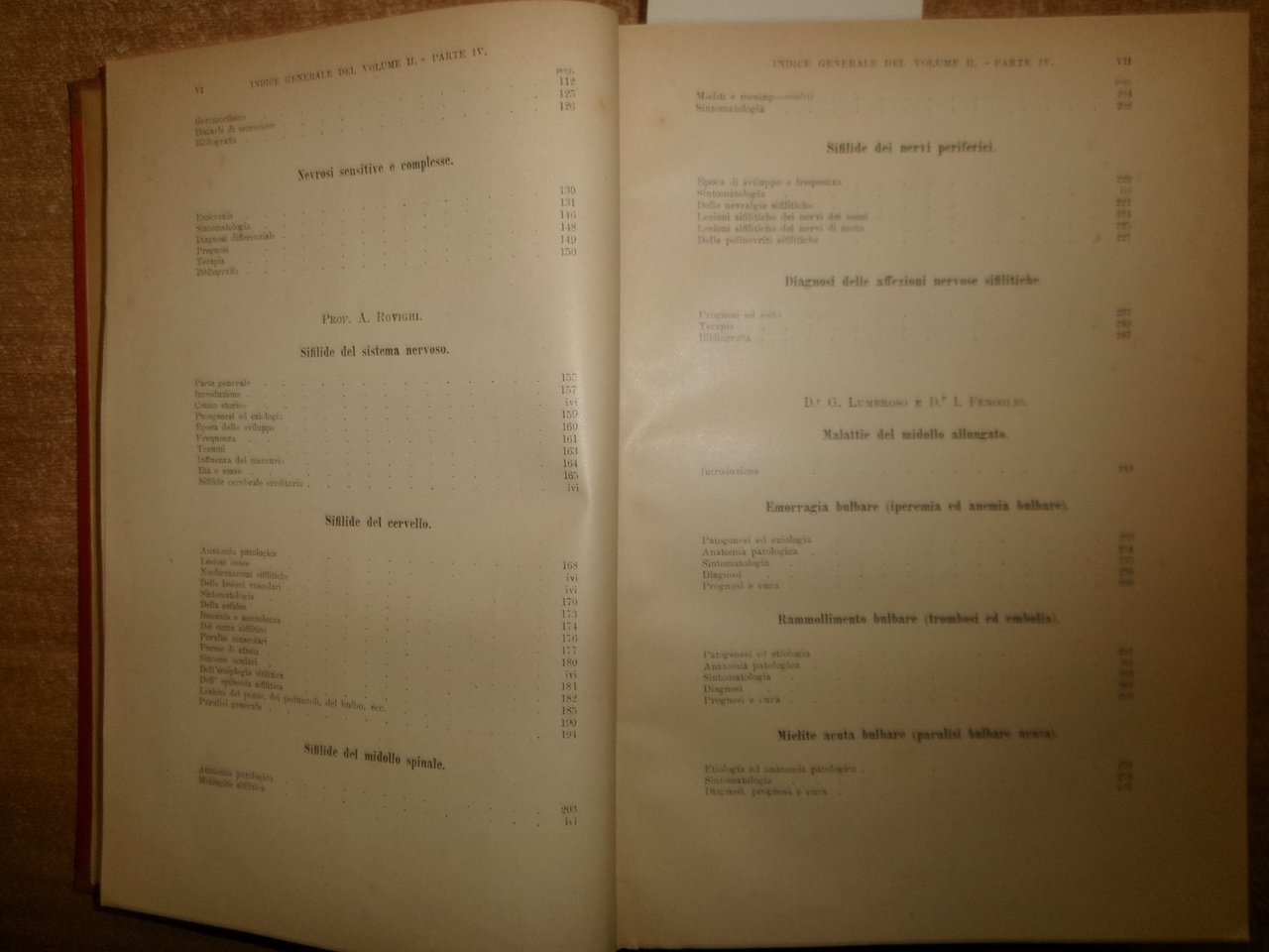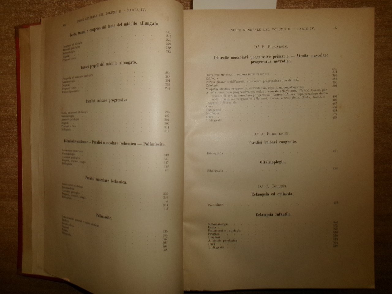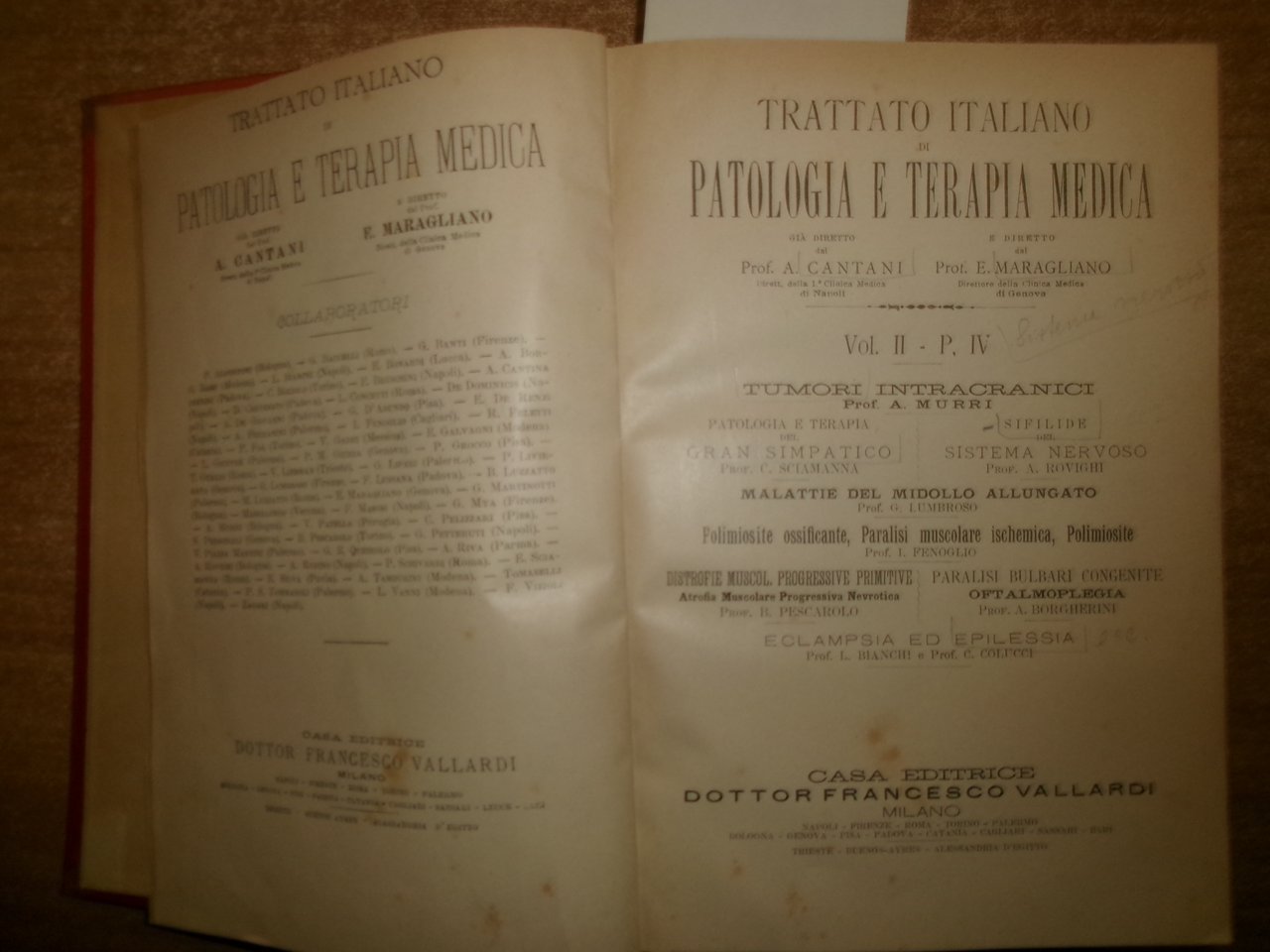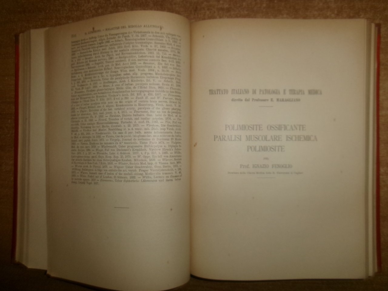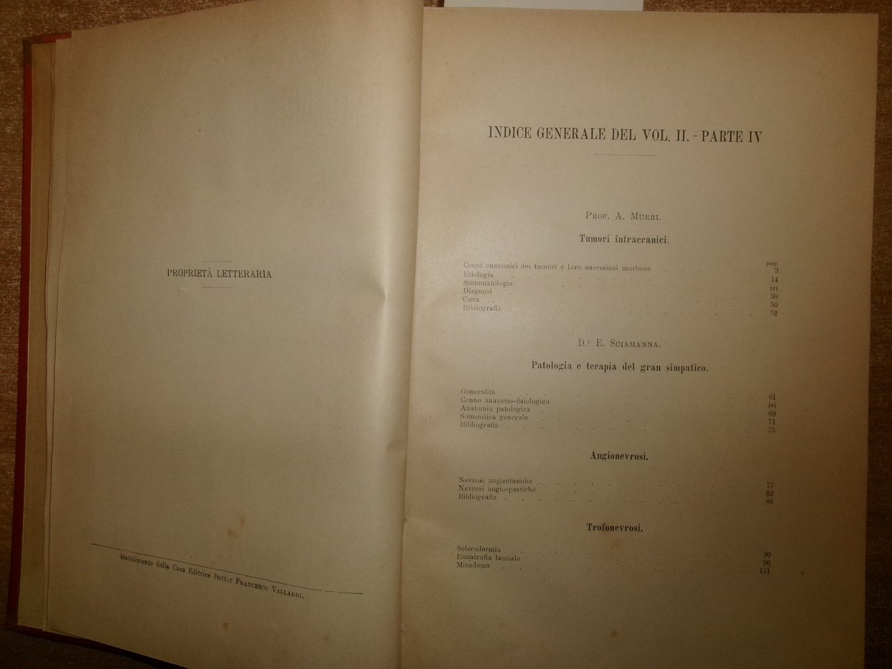 Prof. Augusto Murri. Milano, Casa Editrice Francesco Vallardi, s.d. (fine ottocento). In-8°, m-tela con titolo in oro al dorso. X, 706 pp. con figure in nero n.t. Edizione: argomenti trattati nel presente volume: patologia e terapia del gran simpatico (prof. C. Sciamanna) - sifilide del sistema nervoso (prof. A. Rovighi) - malattie del midollo allungato (prof. G. Lumbroso) - polimiosite ossificante, paralisi muscolare ischemica, polimiosite (prof. I. Fenoglio) - distrofie musc. progressive primitive, atrofia muscolare progressiva nevrotica (prof. B. Pescarolo) - paralisi bulbari congenite, oftalmoplegia (prof. A. Borgherini) - eclampsia ed epilessia (prof. I. Bianchi e prof. C. Colucci). Ben conservato. Uff. salon. sporta 7
