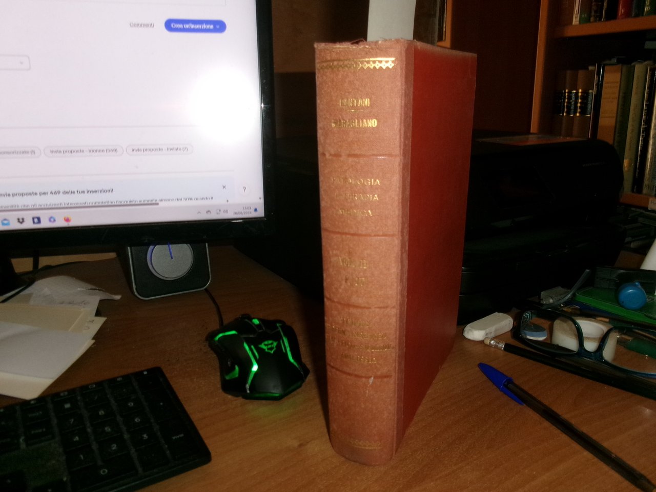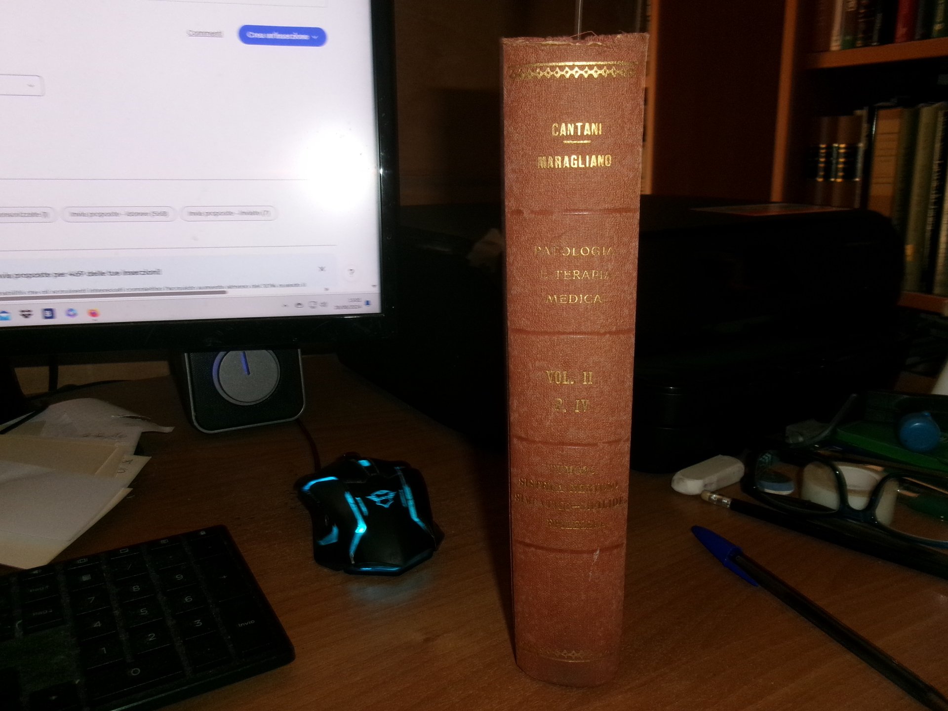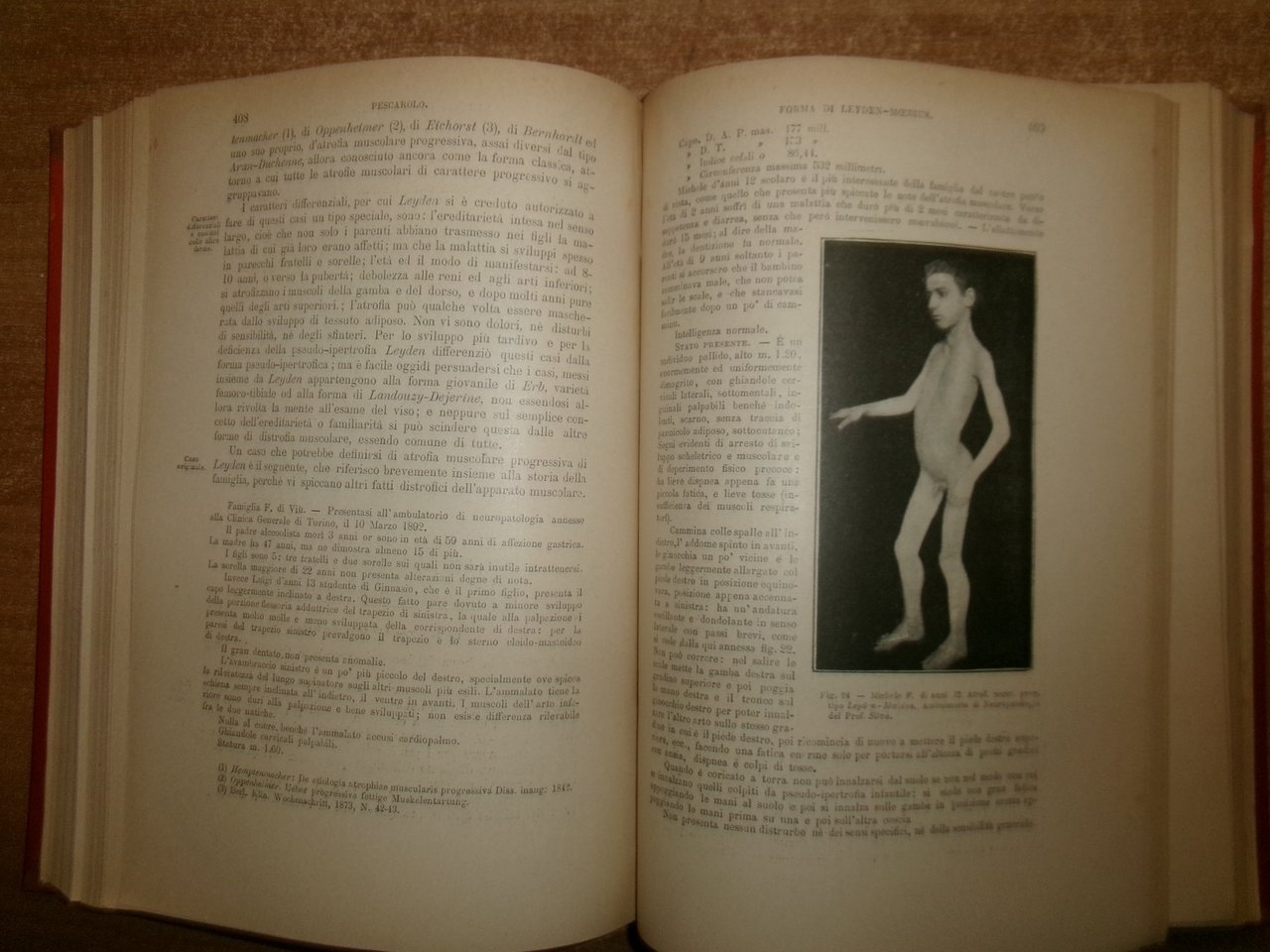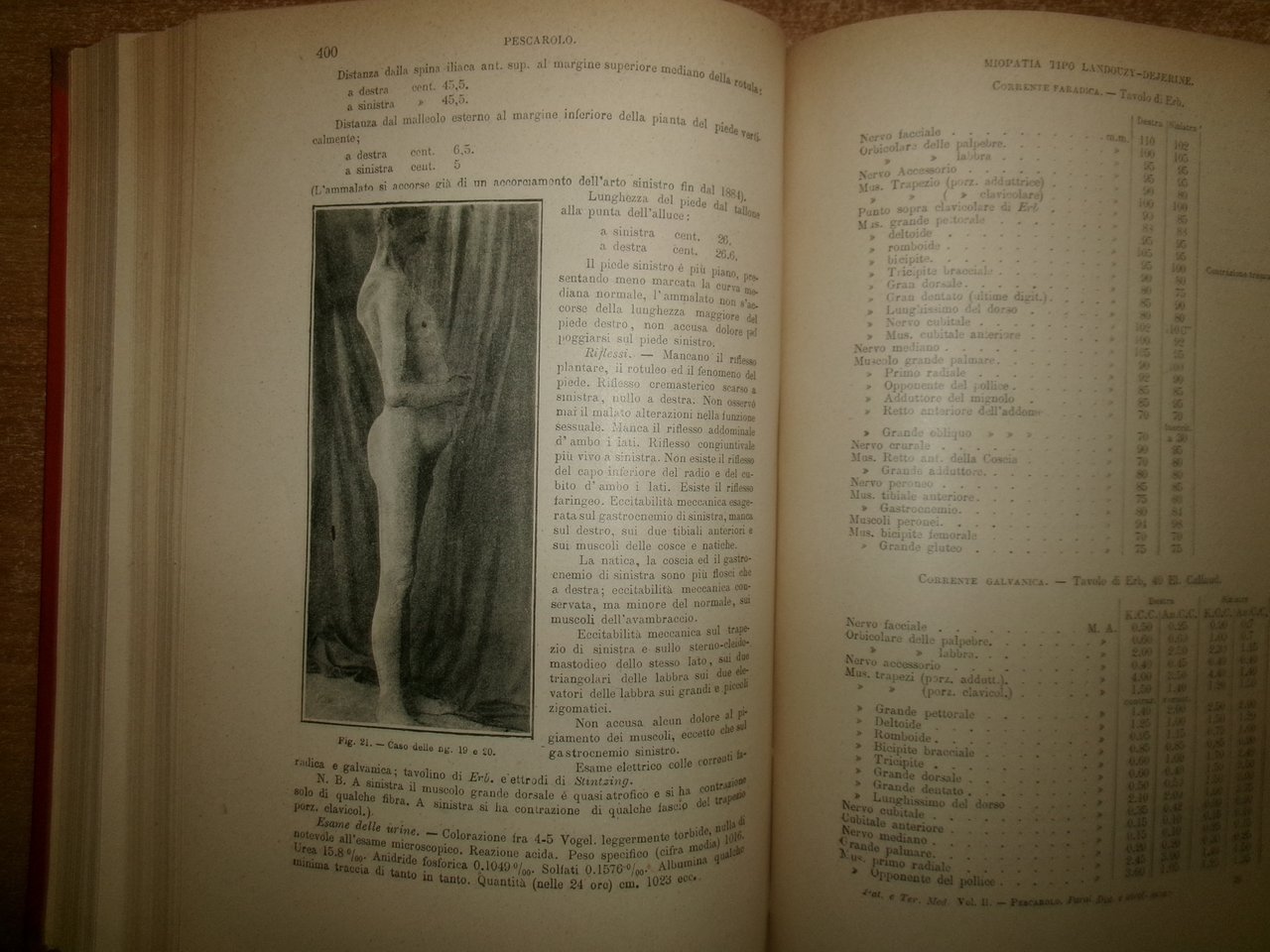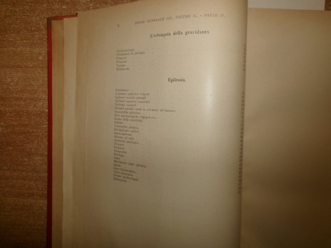Prof. Augusto Murri. Milano, Casa Editrice Francesco Vallardi, s.d. (fine ottocento). In-8°, m-tela con titolo in oro al dorso. X, 706 pp. con figure in nero n.t. Edizione: argomenti trattati nel presente volume: patologia e terapia del gran simpatico (prof. C. Sciamanna) - sifilide del sistema nervoso (prof. A. Rovighi) - malattie del midollo allungato (prof. G. Lumbroso) - polimiosite ossificante, paralisi muscolare ischemica, polimiosite (prof. I. Fenoglio) - distrofie musc. progressive primitive, atrofia muscolare progressiva nevrotica (prof. B. Pescarolo) - paralisi bulbari congenite, oftalmoplegia (prof. A. Borgherini) - eclampsia ed epilessia (prof. I. Bianchi e prof. C. Colucci). Ben conservato. Uff. salon. sporta 7