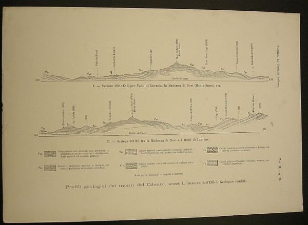 Profili geologici dei monti del Cilento, secondo . Baldacci, dell'Ufficio Geologico (inediti). Tratto da " La penisola italiana : saggio di corografia scientifica" di Teobaldo Fischer.