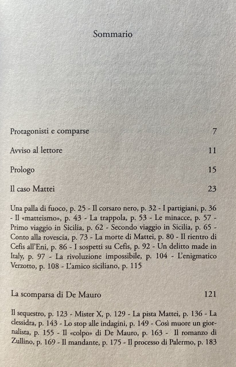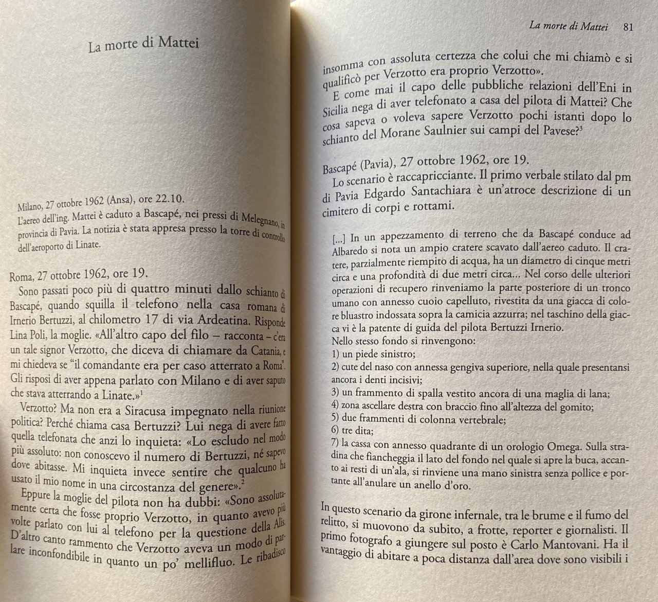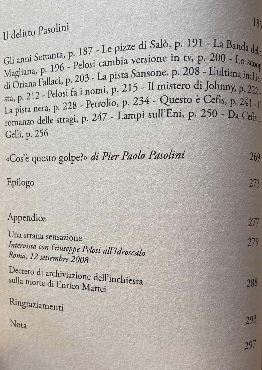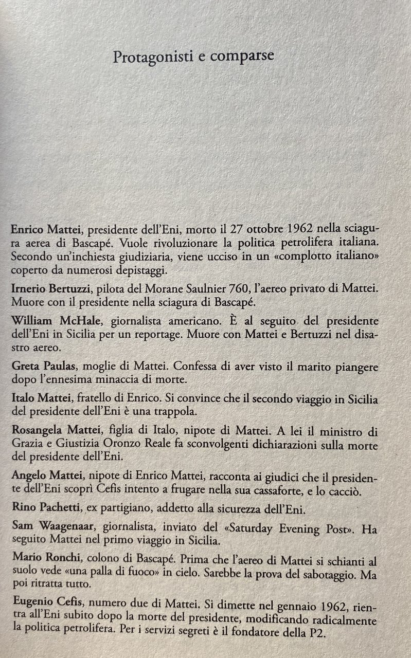 Soggetti: Reportage, Inchieste giornalistiche, Misteri d'Italia Stragismo, Stragi, Strategia della tensione, Politica, Attualità, Giornalismo, Documenti segreti, Segreto di Stato, Sicurezza, Omicidi eccellenti, Anni Settanta Morte Enrico Mattei Eni Compagnie petrolifere internazionali Pierpaolo Pasolini Petrolio Denuncia Destra Corriere della Sera Verità Uccisione Storia contemporanea Eversione Eugenio Cefis Fanfani Servizi segreti Logge massoniche Massoneria P2 Sistema Controllo Informazione Corruzione Partiti politici Rapporti Potere economico Classe dirigente Carte Processi Vincenzo Calia Atti Palermo Testimonianze Ricerca documentale Prima Repubblica Libri fuori catalogo Saggistica Attentati Terrorismo Libro nero Aereo Bascapè Pavia 1962 Corsaro Sette Sorelle Viaggio Sicilia Rivoluzione Autonomia Indipendenza energetica Incidente Complotti Complicità Istituzioni Depistaggio Trame oscure Nemici Indagini Magistratura Sentenza L'Ora Graziano Verzotto Relazioni internazionali Mafia Sisde Idroscalo Banda della Magliana Boris Giuliano Borsellino Buttafuoco Carabinieri Caso Collaboratore D'Angelo Anic Fascisti Gagliano Gela Golpe Graziano Verzotto Guarrasi Italo Johnny lo Zingaro Avvocato Macchina Mandanti Massacro Mistero Montedison Morane Saulnier Nisticò Pestaggio Petrolifero Pilota Pino la Rana Pista Politica Polizia Presidente Raffaele Girotti Ricostruzione Romanzo Sabotaggio Scomparsa Sequestro Sergio Citti Snam Società Stefano Bontade Steimetz Telefonata Anni di piombo Multinazionali Pino Arlacchi Io so Criminologia Delitti eccellenti Agenda Quaderni Appunti Lampi Sinistra Monti Bombe Italo Ormanni Guido Calvi Marazzitta Enrico Cuccia Mediobanca Finanza Buscetta Verzotto Zullino Scoop Oriana Fallaci Licio Gelli Interviste Articoli Stampa Editoria Fonti Greta Paulas Rino Pachetti Mario Ronchi Sam Waagenaar Rosangela William McHale Irnerio Bertuzzi Cazzaniga Gritti Esso Gualtiero Nicotra Buttafuoco Franco Rosi Vito Guarrasi Angelo Fornara Mastini Rana Luciano Garofano Agguato Premeditazione Nino Salvo Di Bella Marcello Boldrini Briatico Bruno Contrada Diana De Martino Antonio Ingroia Carlo Alberto Dalla Chiesa Vito Miceli Sismi Ugo Saito Verbali Occultamento Prove Nisticò Fronte di liberazione nazionale Algeria Anticomunismo Guerra fredda Nomi Responsabili Roberta Torre Journalistic investigations Mysteries of Italy Massacres Strategy of tension Politics Current affairs Journalism Documents State Security Excellent murders 1970s Death International oil companies Right-wing denunciation Truth Killing Contemporary history Subversion Secret services Masonic Lodges Freemasonry System Control Information Corruption Political parties Relationships Economic power Ruling class Papers Trials Acts Testimonials Documentary research First Republic Books out of print Non-fiction Attacks Terrorism Black book Private plane Seven Sisters Journey to Sicily Revolution Autonomy Energy independence Accident Conspiracies Complicity Institutions Misdirection Dark plots Enemies Investigations Judiciary Judgment International relations Case Collaborator Fascists Coup Lawyer Machine Principals Massacre Mystery Beating Pilot Track Politics Police President Reconstruction Novel Sabotage Disappearance Kidnapping Society Phone call Years of lead Multinationals I know Criminology Excellent crimes Notebooks Notes Lightning Left Bombs Finance Interviews Articles Press Publishing Sources Ambush Premeditation Minutes Concealment Evidence National Liberation Front Anti-communism Cold War Names Responsible