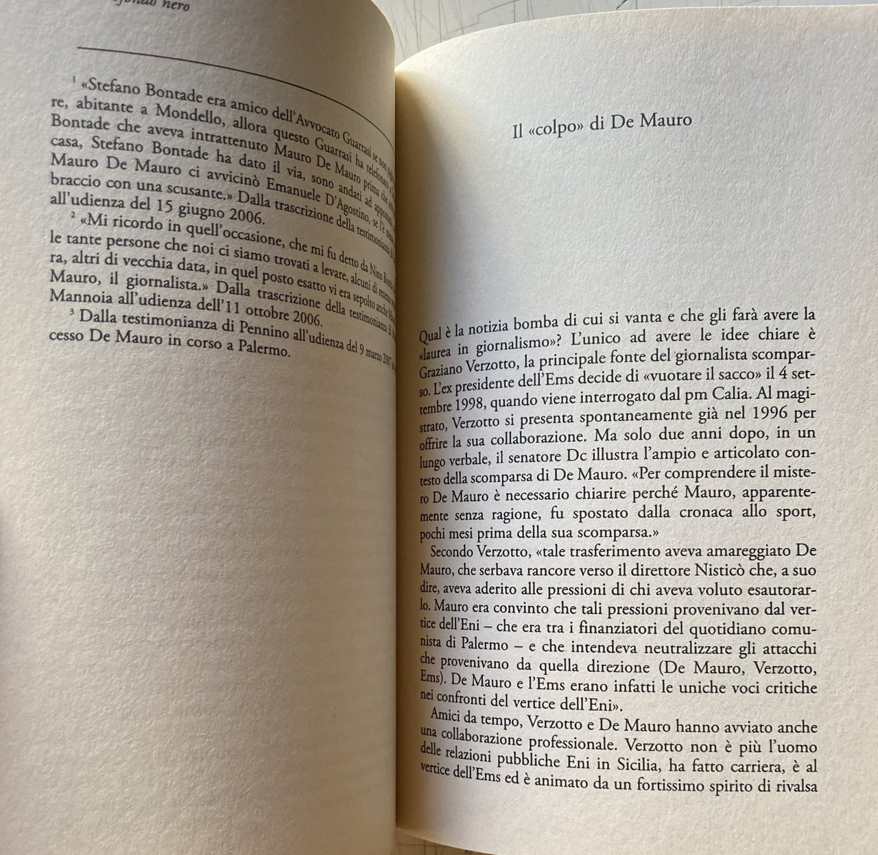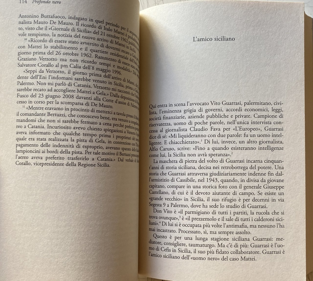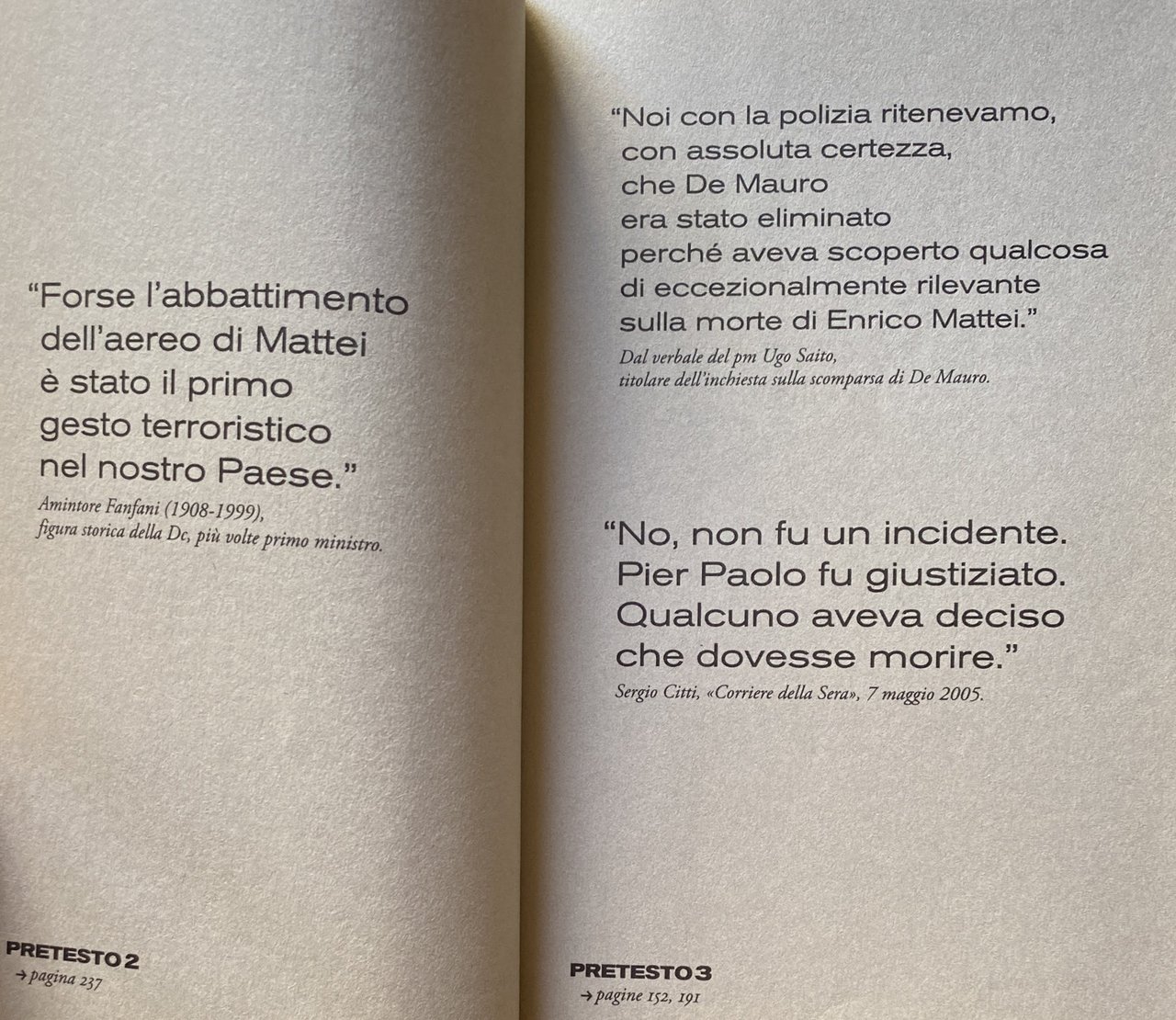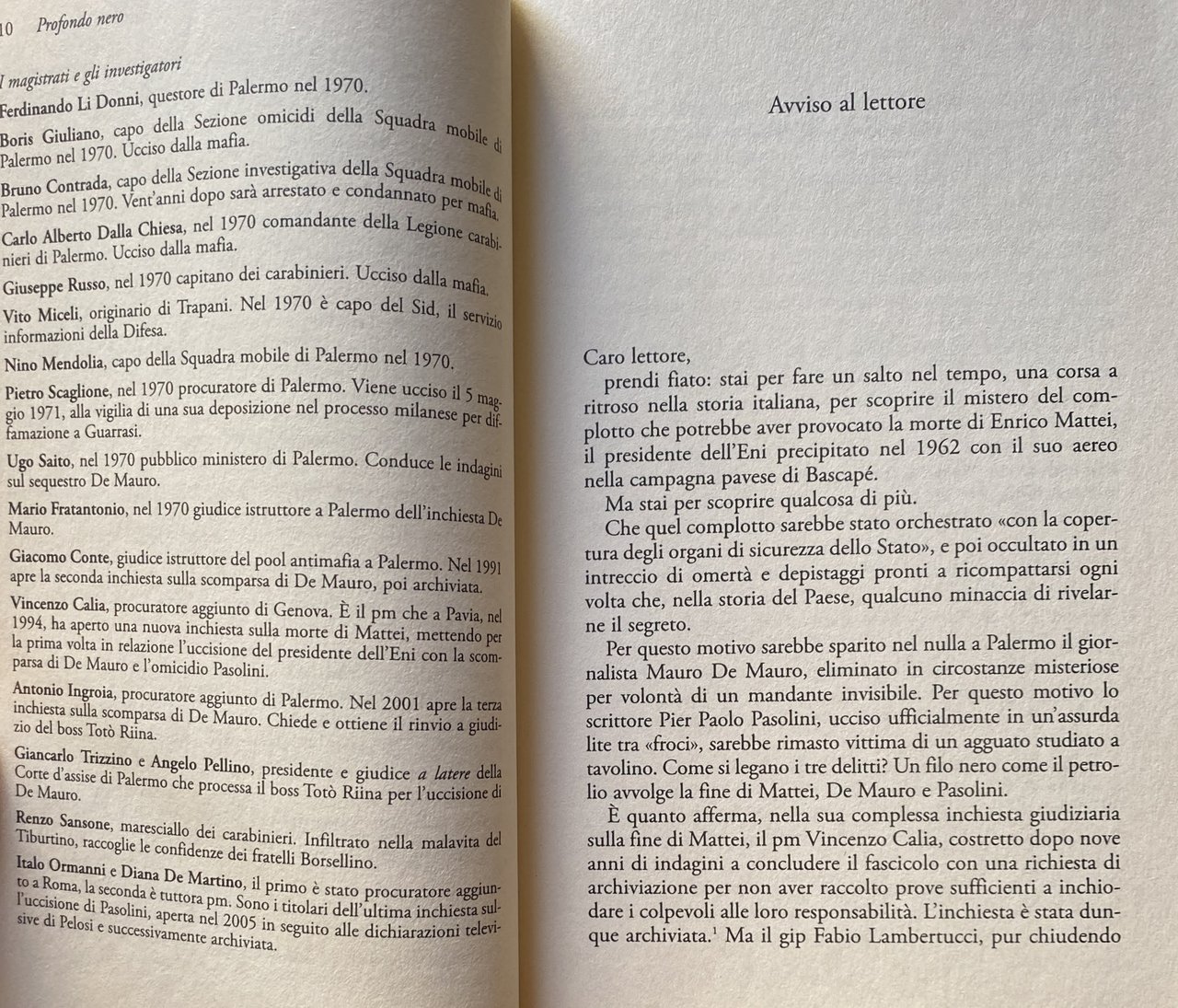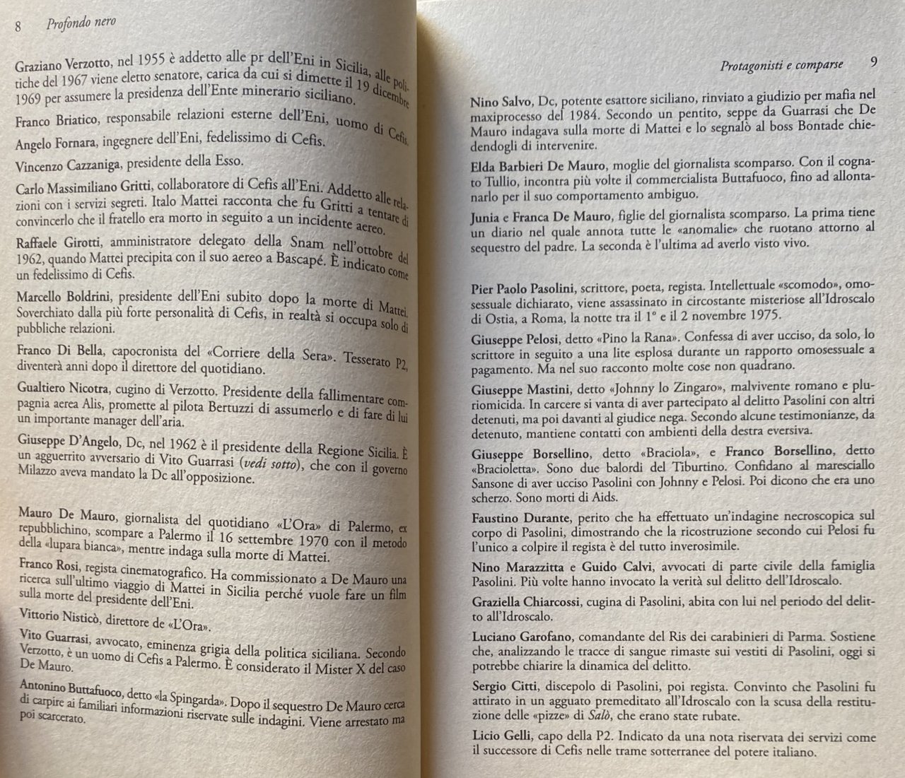 Soggetti: Reportage, Inchieste giornalistiche, Misteri d'Italia Stragismo, Stragi, Strategia della tensione, Politica, Attualità, Giornalismo, Documenti segreti, Segreto di Stato, Sicurezza, Omicidi eccellenti, Anni Settanta Morte Enrico Mattei Eni Compagnie petrolifere internazionali Pierpaolo Pasolini Petrolio Denuncia Destra Corriere della Sera Verità Uccisione Storia contemporanea Eversione Eugenio Cefis Fanfani Servizi segreti Logge massoniche Massoneria P2 Sistema Controllo Informazione Corruzione Partiti politici Rapporti Potere economico Classe dirigente Carte Processi Vincenzo Calia Atti Palermo Testimonianze Ricerca documentale Prima Repubblica Libri fuori catalogo Saggistica Attentati Terrorismo Libro nero Aereo Bascapè Pavia 1962 Corsaro Sette Sorelle Viaggio Sicilia Rivoluzione Autonomia Indipendenza energetica Incidente Complotti Complicità Istituzioni Depistaggio Trame oscure Nemici Indagini Magistratura Sentenza L'Ora Graziano Verzotto Relazioni internazionali Mafia Sisde Idroscalo Banda della Magliana Boris Giuliano Borsellino Buttafuoco Carabinieri Caso Collaboratore D'Angelo Anic Fascisti Gagliano Gela Golpe Graziano Verzotto Guarrasi Italo Johnny lo Zingaro Avvocato Macchina Mandanti Massacro Mistero Montedison Morane Saulnier Nisticò Pestaggio Petrolifero Pilota Pino la Rana Pista Politica Polizia Presidente Raffaele Girotti Ricostruzione Romanzo Sabotaggio Scomparsa Sequestro Sergio Citti Snam Società Stefano Bontade Steimetz Telefonata Anni di piombo Multinazionali Pino Arlacchi Io so Criminologia Delitti eccellenti Agenda Quaderni Appunti Lampi Sinistra Monti Bombe Italo Ormanni Guido Calvi Marazzitta Enrico Cuccia Mediobanca Finanza Buscetta Verzotto Zullino Scoop Oriana Fallaci Licio Gelli Interviste Articoli Stampa Editoria Fonti Greta Paulas Rino Pachetti Mario Ronchi Sam Waagenaar Rosangela William McHale Irnerio Bertuzzi Cazzaniga Gritti Esso Gualtiero Nicotra Buttafuoco Franco Rosi Vito Guarrasi Angelo Fornara Mastini Rana Luciano Garofano Agguato Premeditazione Nino Salvo Di Bella Marcello Boldrini Briatico Bruno Contrada Diana De Martino Antonio Ingroia Carlo Alberto Dalla Chiesa Vito Miceli Sismi Ugo Saito Verbali Occultamento Prove Nisticò Fronte di liberazione nazionale Algeria Anticomunismo Guerra fredda Nomi Responsabili Roberta Torre Journalistic investigations Mysteries of Italy Massacres Strategy of tension Politics Current affairs Journalism Documents State Security Excellent murders 1970s Death International oil companies Right-wing denunciation Truth Killing Contemporary history Subversion Secret services Masonic Lodges Freemasonry System Control Information Corruption Political parties Relationships Economic power Ruling class Papers Trials Acts Testimonials Documentary research First Republic Books out of print Non-fiction Attacks Terrorism Black book Private plane Seven Sisters Journey to Sicily Revolution Autonomy Energy independence Accident Conspiracies Complicity Institutions Misdirection Dark plots Enemies Investigations Judiciary Judgment International relations Case Collaborator Fascists Coup Lawyer Machine Principals Massacre Mystery Beating Pilot Track Politics Police President Reconstruction Novel Sabotage Disappearance Kidnapping Society Phone call Years of lead Multinationals I know Criminology Excellent crimes Notebooks Notes Lightning Left Bombs Finance Interviews Articles Press Publishing Sources Ambush Premeditation Minutes Concealment Evidence National Liberation Front Anti-communism Cold War Names Responsible
