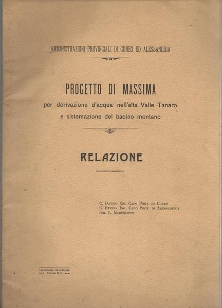 Progetto di massima per derivazione d'acqua nell'alta Valle Tanaro e sistemazione del bacino montano. Relazione. C. Daviso Ing. Capo Prov. Di Cuneo; C. Rivera Ing. Capo Prov. di Alessandria; Ing. L. Marescotti.