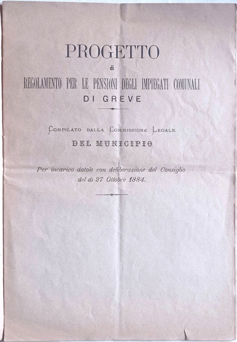 Progetto di regolamento per le pensioni degli impiegati comunali di Greve. Compilato dalla Commissione Legale del Municipio. Per incarico datole con deliberazione del Consiglio del dì 27 ottobre 1884.