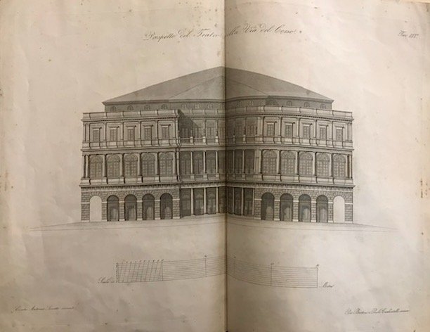 Folio (cm. 48), 20 pp., 4 tavole all’acquatinta su doppia pagina f.t. (incise da Paolo Cacchiatelli, Pio Bertoni e Tommaso Labruzzi su disegni del conte Lovatti). Brossura editoriale (tracce d’usura). Angoli arricciati e con mancanze, fioriture sparse. Raro progetto presentato al Municipio di Roma per la realizzazione di un teatro in via del Corso. Provenienza: collezione Moretti, Roma (timbretto ex libris al frontespizio). Non in Rossetti.
