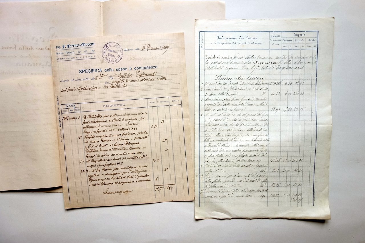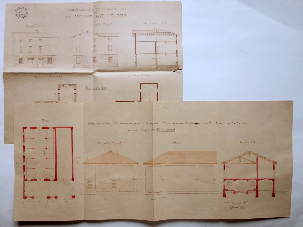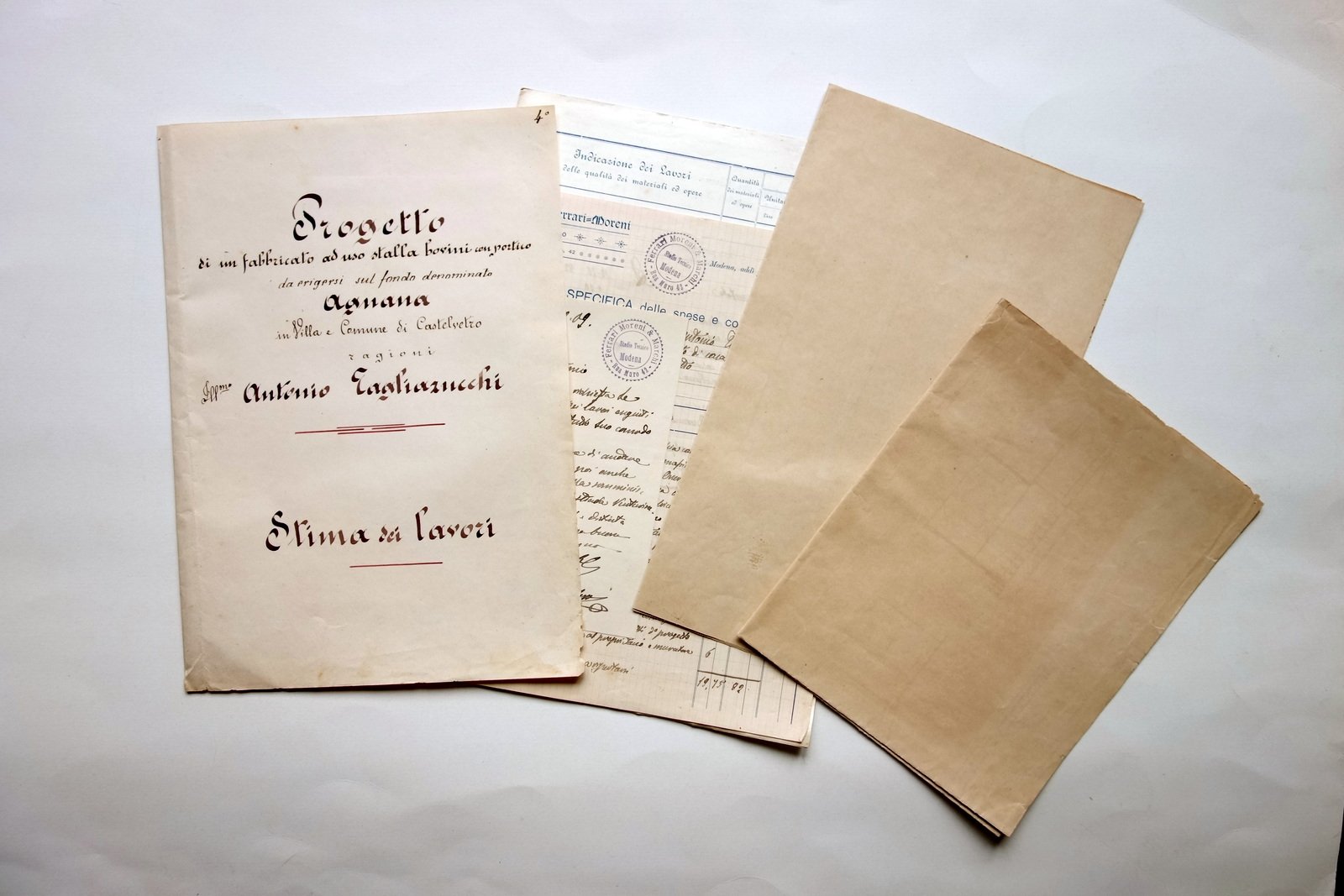 Progetto - stima dei lavori, Progetto di un fabbricato ad uso stalla bovini con portico da erigersi sul fondo denominato Agnana" in Villa e Comune di Castelvetro ragioni ill. mo Antonio Tagliazucchi - Stima dei Lavori 1909; progetto costituito da vari fogli di documentazione tra cui il costo stimato dei lavori, pi√π due piante ripiegate pi√π volte con sezioni e spaccati del fabbricato in itinere (vedi foto). Documentazione inserita entro carpetta cartacea con titolo annotato a mano. Condizioni di conservazione Esemplare in buono stato con tracce d'uso, minime marginali sgualciture alla documentazione, leggerissimi accenni di ingiallimento. Piante con pochi piccoli marginali strappetti. Per maggiori dettagli vedi foto. SC03.D17252 N "
