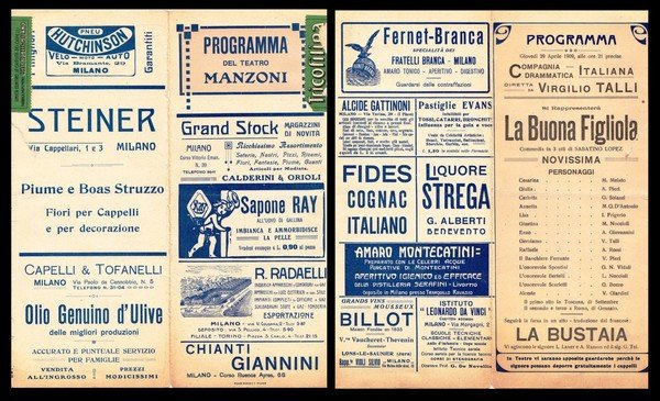 In 8°, depliant di 6 facciate con il programma del Teatro Manzoni di Milano del 29 Aprile 1909 con numerose pubblicità dell'epoca; sono presenti 3 strappetti in corrispondenza della piegatura; discreto es.