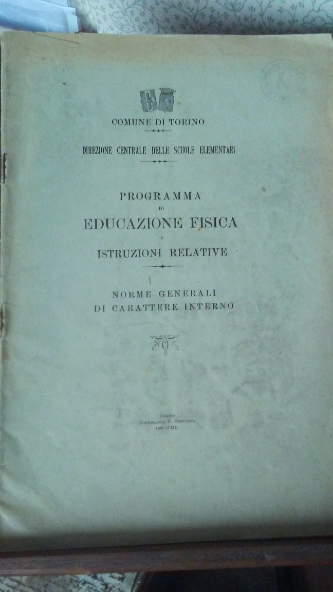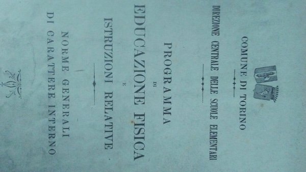 Fascicolo in folio, brossura editoriale, titolo al piatto, frontespizio (timbro di propriet), prefazione, 40 pp. Rara pubblicazione sulleducazione fisica, stampata a cura della direzione generale delle scuole della citt di Torino, caratterizzata da un impronta didattica molto incisiva, con la spiegazione dei vari esercizi indicati: Deambulazione, Equilibrio, Marcia, Corsa, Salto, Arrampicata, Appoggio, Sospensione, Esercizi per rinforzo dei muscoli, Lancio, Nuoto ed altro. Interessante, poco comune. In bello stato.