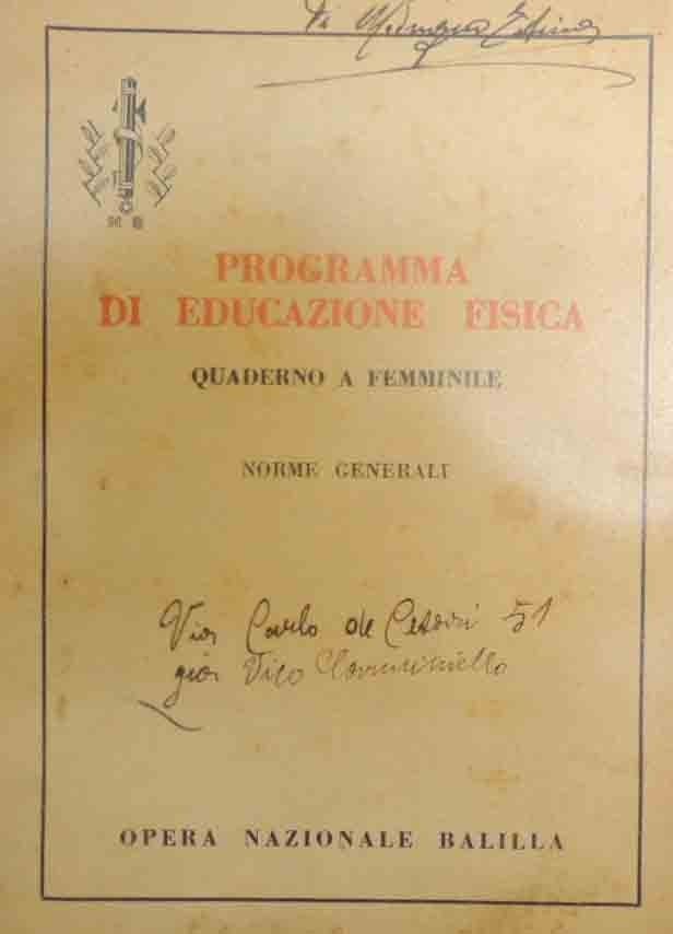 Programma di educazione fisica. Quaderno A femminile. Norme generali, Opera Nazionale Balilla, s.l., s.d., pp. 29, cm 20, opuscolo spillato. Firma d’appartenenza alla prima di copertina e al frontespizio, minime fioriture alla copertina, lievi tracce d’uso, qualche segnetto di lapis, per il resto ben conservato.
