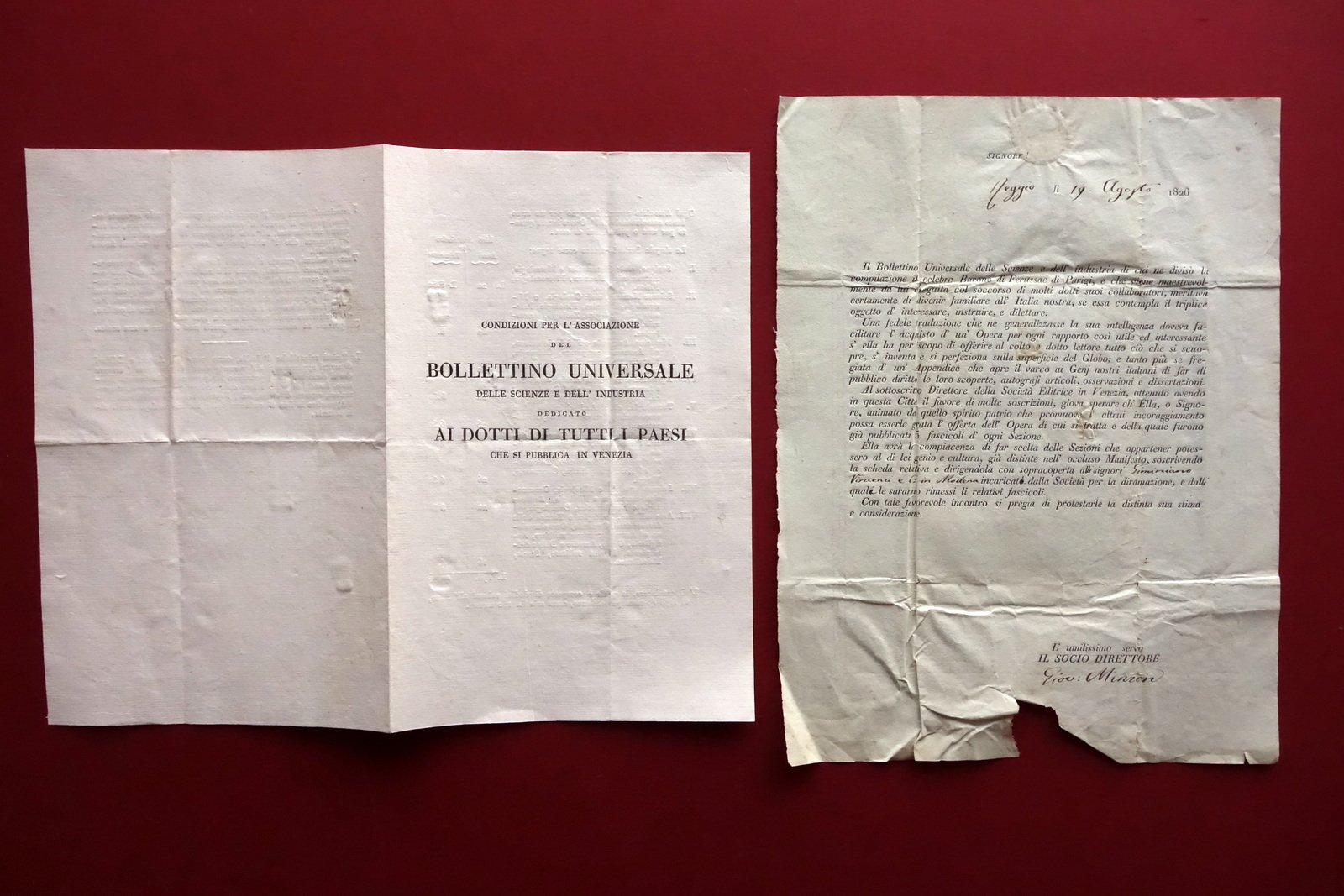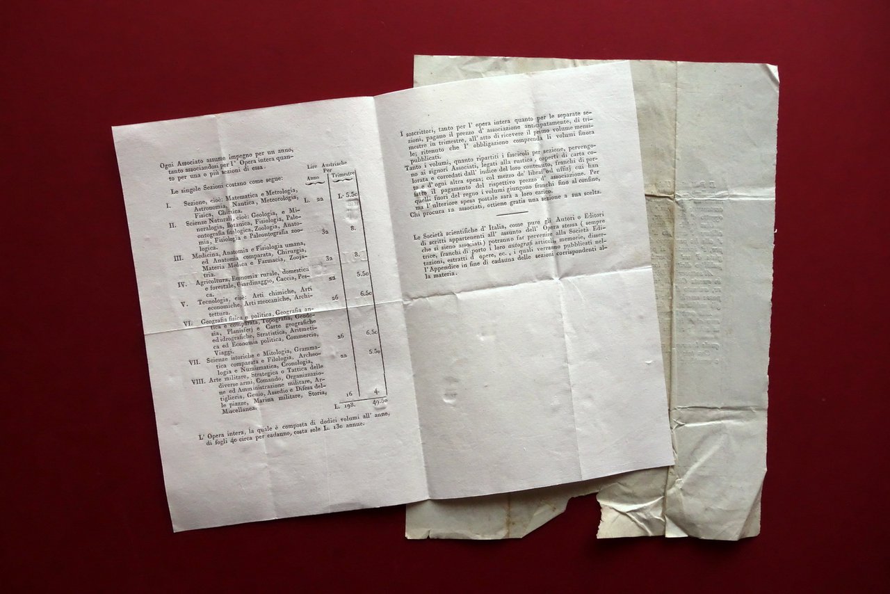 Programma per associazione a rivista, Condizioni per associazione al Bollettino Universale delle Scienze e dell'Industria, dedicato ai dotti di tutti i paesi" bifolio e lettera di presentazione 1826 1826; bifolio e lettera di presentazione a stampa, per associazione al bollettino indicato sopra. La lettera presenta sezioni bianche compilate manualmente. Cm 25,5x19 (lettera); cm 21,5x13,5 (bifolio). Condizioni di conservazione Entrambi i fogli in buone condizioni con tracce d'uso e normali pieghe per spedizione postale; lettera con qualche piccola brunitura, al margine inferiore stropicciature e una piccola mancanza che non interessa il testo dovuta all'apertura maldestra della missiva. Per ulteriori dettagli vedi foto. SC03.D19713 N "