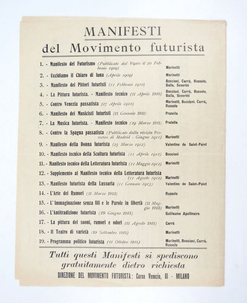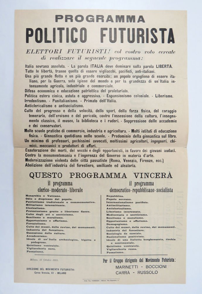 MANIFESTOEdizione originale.Ottimo esemplare.Uno dei più rappresentativi manifesti futuristi. Una copertina (p. [1]), che ospita la scritta centrata «Programma politico futurista», precede il testo stampato in orizzontale su doppia pagina come per essere affisso: il programma («Elettori futuristi! col vostro voto cercate di realizzare il seguente programma: Italia sovrana assoluta. - [.] Abolizione dell’industria del forestiero, umiliante ed aleatoria») è seguito dalla mistificazione dei programmi avversari, il «clerico- moderato- liberale» e il «democratico- repubblicano- socialista», punto per punto. Inutile dire che entrambi gli altri programmi si concludono con il punto «Passatismo». In calce ai testi la firma «Per il gruppo dirigente del Movimento Futurista: / Marinetti - Boccioni / Carrà - Russolo». A p. [4], come quarta di copertina, l’elenco dei Manifesti del Movimento futurista. -- In una lettera del tardo ottobre 1913 Marinetti scrive a Soffici: «Sarò con Carrà a Firenze venerdì 24 ottobre alle cinque e un quarto pomeridiane. Vieni alla stazione con Papini e Tavolato. Abbiamo bisogno di molte braccia futuriste per lanciare d un’automobile per tutta Firenze innumerevoli programmi politici futuristi».Tonini, I manifesti, 66.1