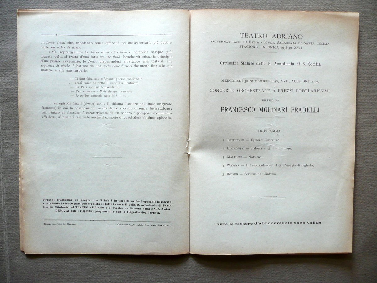 Programma, Teatro Adrian Governatorato di Roma - Regia Accademia di Santa Cecilia Stagione sinfonica 1938-39 Orchestra Stabile della R. Accademia di S. Cecilia Domenica 27 novembre 1938, XVII, alle ore 17 Concerto orchestrale diretto da Igor Strawinsky con la partecipazione del pianista Soulima Strawinsky Programma [.] Soc. Tip. A. Manuzio, Roms 1938; cm 24,5x17; pp. non num. (pp. 12), con una ill. fotogr. in b/n fuori t.; brossura ed. Condizioni di conservazione Esemplare ben conservato con tracce d'uso, leggerissimi accenni d'ingiallimento dovuti all'età, poche minuscole bruniture; dorso con minimi strappetti in corrispondenza della spillatura e conseguente leggero distacco del corpo del testo. SC03.D12885 N