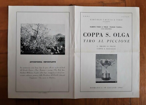 Programmi Circolo caccia e tiro - Palermo. Campo tiro a volo "Paolo Tasca" Coppa S. Olga Tiro al piccione. 1949