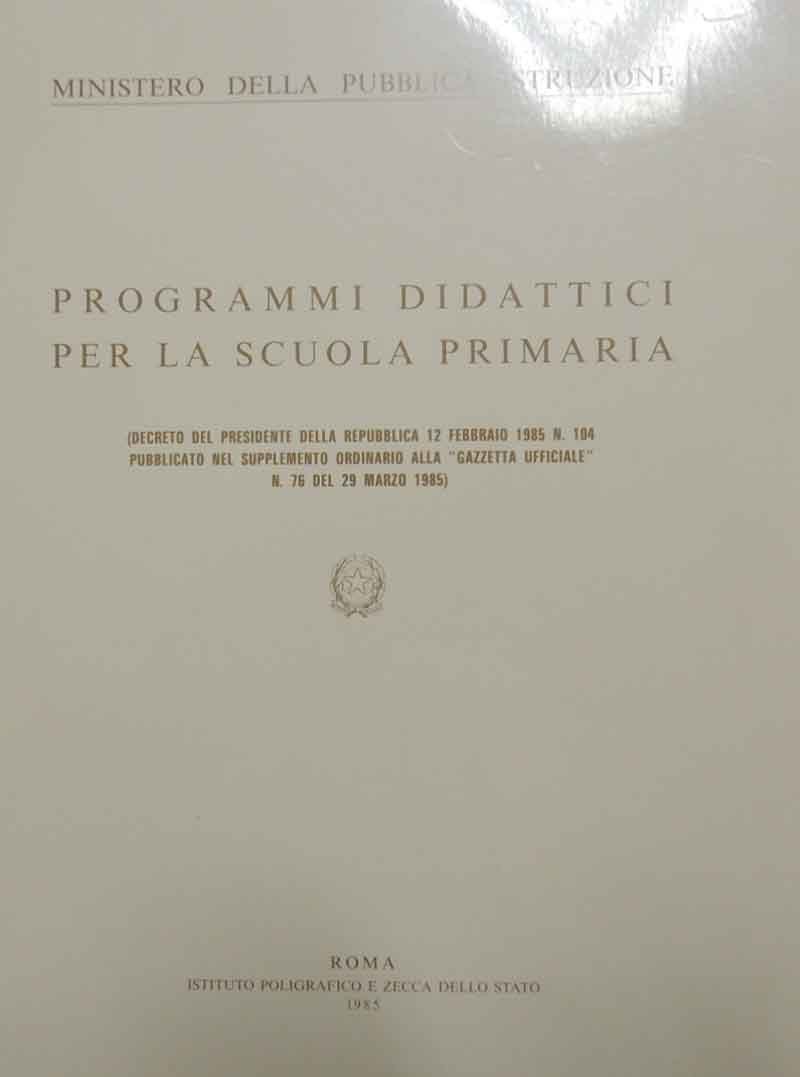 Ministero della Pubblica Istruzione, Programmi didattici per la scuola primaria. (Decreto del Presidente della Repubblica 12 febbraio 1985 n. 104 pubblicato nel supplemento ordinario alla Gazzetta Ufficiale n. 76 del 29 marzo 1985), Istituto Poligrafico e Zecca dello Stato, Roma 1985, pp. 80, cm 24, br. ed. Perfetto.