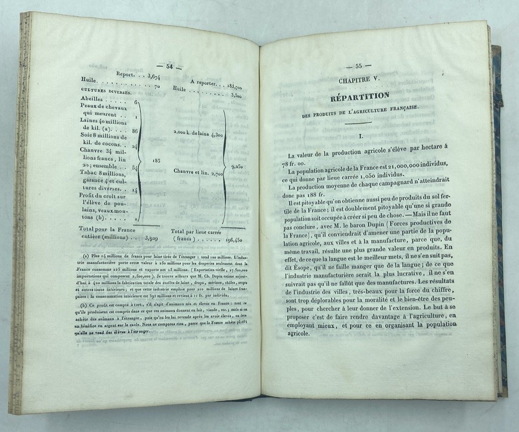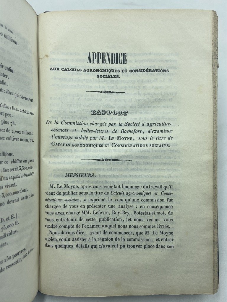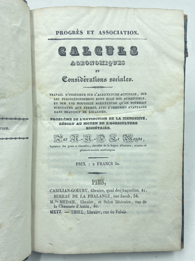 Legatura coeva in mezza pelle con titoli, filetti e fregi dorati sul dorso liscio (graffio), piatti marmorizzati, tagli spruzzati azzurri; in ottavo, cm 20 x 13, pp (4) IV 183 (1), 36. Esemplare da studio, con ampia gora e carte ondulate nella parte superiore per la maggior parte delle pagine. Nicolas R. D. Le Moyne (o Lemoine), «Ingénieur des Ponts et Chaussées» in vari dipartimenti e infine distaccato al servizio della Marina a Rochefort, parallelamente alla carriera d'ingegnere fu autore di numerose memorie di stampo socialista-utopico. Dapprima influenzato dalle teorie di Saint Simon, abbracciò negli anni '30 il pensiero di Charles Fourier e fu parte della École Sociétaire ma negli anni '40, trovando che questa mancasse di praticità nella realizzazione delle idee falangiste, se ne allontanò e portò avanti una propria riflessione che, in estrema sintesi, tentava una sintesi tra tecnocrazia saintsimoniana e forma falansterista. Questo «Progrés et association» fu inviato da Le Moyne al Consiglio generale della Charente-Inférieure che aveva indetto nel 1936 un concorso per premiare l'autore che avesse saputo indicare misure idonee all'eliminazione dell'accantonaggio; l'autore propose l'instaurazione di una falange agricola come miglior mezzo per prevenire la miseria e curarne le ragioni economico-sociali, corredando il progetto d'una notevole quantità di dati statistici economici ed agronomici. Il lavoro non fu premiato, e Le Moyne lo propose alla Société d'Agriculture, Sciences et Belles Lettres di Rochefort, ove era distaccato, ottenendone la pubbliazione. Il rapporto della commissione esaminatrice della Société, con richiami anche ad altre opere di Le Moyne, è posto in appendice. Edizione originale. Crf. Del Bo, Il socialismo utopistico, p. 35 (data l'opera al 1838, ma il rapporto in appendice cita la seduta della Société del gennaio 1839). Non in Einaudi