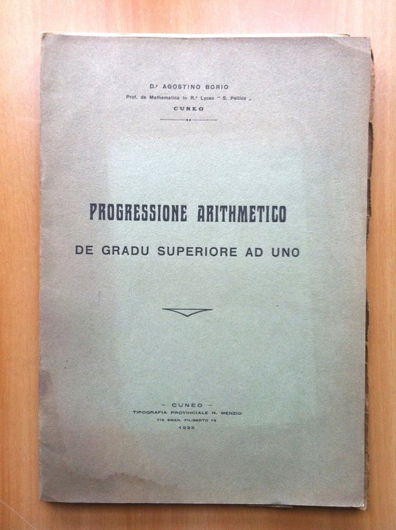 PROGRESSIONE ARITHMETICODE GRADU SUPERIORE AD UNODr. Agostino BorioProf. de Mathematica in R.o Lyceo S. Pellico Cuneo 192514 pagine - formato 17x24,5 cm in ottimo stato (39 g)E14584