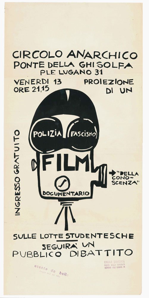 MANIFESTOManifesto originale.Segni di piegatura, ma ottimo esemplare.Il Circolo anarchico Ponte della Ghisolfa fu aperto il primo maggio 1968 in Piazzale Lugano a Milano, e lì vi rimase fino al 1975, quando fu sfrattato. Nel 1976/77 il circolo sposterà la sua sede in una villetta a due piani in viale Monza 255, dove si trova attualmente. è infatti pubblicizzata la proiezione di un film-documentario dal titolo Della conoscenza, che uscì nel 1968 per la regia di Alessandra Bocchetti, attivista e scrittrice: «Realizzato insieme ad una redazione designata dal movimento studentesco, il documentario analizza le motivazioni ideologiche e la situazione storica che sono alla base del ruolo e delle lotte condotte dagli studenti e dai giovani nel 1968». È verosimile pensare che la proiezione del documentario al Ponte della Ghisolfa sia avvenuta a ridosso dell’uscita del film, e possiamo dunque datare il manifesto al 1968/1969. Sono anni importanti per il circolo: uno dei militanti più attivi è Giuseppe Pinelli, assassinato di lì a poco, e farà parte del collettivo anche Pietro Valpreda. Dopo la morte del primo e l’arresto del secondo, inizierà una "campagna per la verità” che continua anche oggi. Di grande interesse è l’impianto grafico, vicino a quello dei celebri manifesti del Maggio francese prodotti a Parigi dall’«Atelier Populaire»