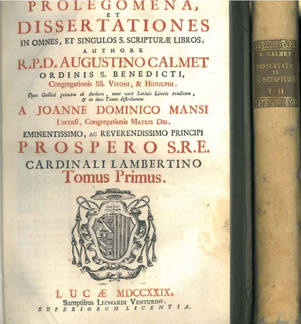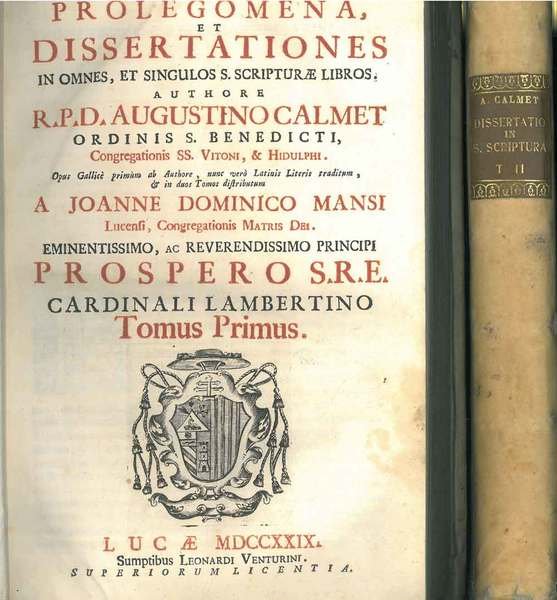 Prolegomena, et dissertationes in omnes, et singulos S. Scripturae libros. Authore r.p.d. Augustino Calmet ordinis S. Benedicti,. Opus Gallice primum ab authore, nunc vero Latinis literis traditum, & in duos tomos distributum a Joanne Dominico Mansi Lu