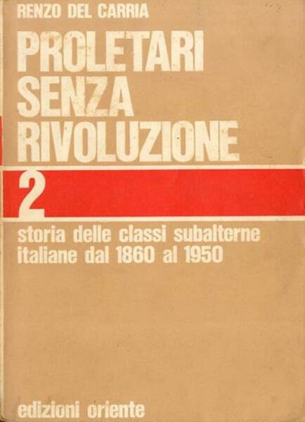 2. ed. 453 p., [4] c. do tav. ripieg. : ill. ; 21 x 15 cm. Renzo Del Carria avvocato, da giovane partecipò alla Resistenza partigiana unendosi alle brigate di Giustizia e Libertà. Dal 1945 al 1960 ha aderito al PCI, ma successivamente si è avvicinato ai movimenti d'ispirazione maoista. Nel 1966 il suo nome riscuote l'attenzione della stampa e dell'opinione pubblica con l'uscita del suo libro "Proletari senza rivoluzione", pubblicato dalle Edizioni Oriente. Quest'opera è un tentativo di scrivere una contro-storia d'Italia dalla parte delle classi subalterne. Il libro ebbe particolare successo tra i giovani e divenne un punto di riferimento dei sessantottini italiani anche se non mancarono le critiche e polemiche (Del Carria venne accusato ad esempio di utilizzare solo fonti parziali e di seconda mano). . Brossura editoriale, coperta in cartoncino flessibile a colori. All'interno del volume alcune pregiate cartine e tavole illustrate ripiegate. Codice libreria 8254.