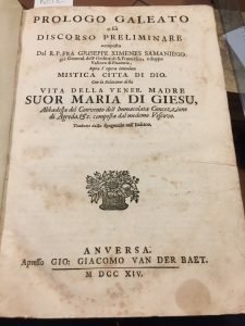 [vt] .SOPRA L'OPERA INTITOLATA MISTICA CITTA DI DIO CON LA RELAZIONE DELLA VITA DELLA VENER. MADRE SUOR MARIA DI GIESU, ABBADESSA DEL CONVENTO DELL IMMACOLATA CONCEZZIONE DI AGREDA, E C. COMPOSTA DAL MEDEMO VESCOVO TRADOTTI DALLO SPAGNUOLO NELL'ITALIANO. Alcuni capilettera e finalino illustrati. Fioriture diffuse, bruniture dovute al tipo di carta, probabile mancanza di una carta alla fine del Prologo Galeato, più che buono nel complesso. Pagg. 204, 1 foglio mancante?, 2. Segue: Divotissime note per maggior intellingenza e difesa della mistica citta di Dio, istoria della vita della Vergine Santissima.Anversa Giacoma Van Der Baet 1713. Pagg. 214. Seconda parte delle note pagg. 80. Terza parte delle note Pagg. 46. Segue Tavola dei luoghi della Sacra Scrittura Pagg. 104, 15 ,2. Bella legatura in piena pergamena coeva. Mis mm 257x175