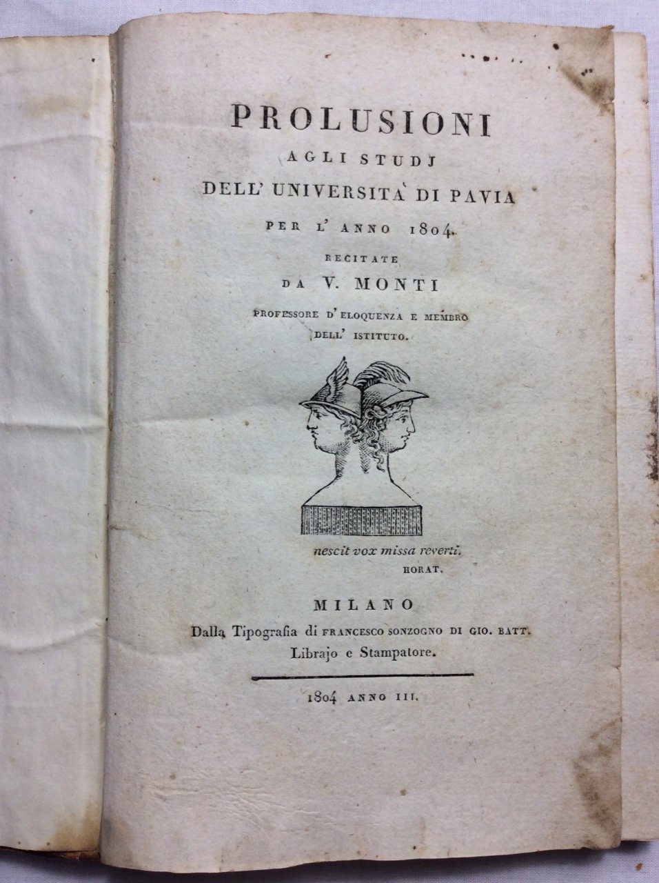 PROLUSIONI AGLI STUDJ DELL'UNIVERSITA' DI PAVIA PER L'ANNO 1804. - Recitate da V. Monti Professore d'Eloquenza e membro dell'Istituto.