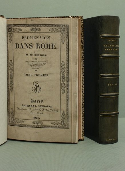 2 voll. in - 8ø; 2 cc., IV, 450 pp., 1 c. (errata), 1 tavola fuori testo incisa in rame - 2 cc., 592 pp., 2 tavole fuori testo incise in rame. Complessivamente nei due volumi sono presenti, come dalle schede delle bibliografie, le due tavole che fungono da antiporta: Colonne Trajane, S. Pierre, e la tavola ripiegata con il Plan des vestiges de Rome antique et des douze Collines voisines du Tibre. Quest'ultima tavola Š qui nella sua prima tiratura. Alcuni esemplari contengono anche la tavola in seconda tiratura con piccole modifiche. Legatura dei primi del '900 in tutto marocchino blu con titoli e filetti in oro al dorso, merletto interno, tagli dorati, conservate le copertine editoriali a stampa (minimi restauri marginali a quella posteriore del volume II, consolidamento ad una cerniera). Bell'esemplare. Prima edizione. Stendhal nella prefazione ci informa di essere venuto sei volte a Roma, di aver preso in affitto due camere a fianco di Trinit… de' Monti in Via Gregoriana da cui poteva ammirare "les trois quarts" della citt… e di essersi applicato diligentemente alla visita dei monumenti. Inizia cos? una narrazione basata su appunti presi sin dal 1817, in cui si delinea un affascinante itinerario fatto di puntuali descrizioni e impressioni artistiche, di racconti storici, di cronache antiche e contemporanee, di vivacissimi commenti e rilevanti giudizi. Nessuna guida turistica moderna appare tanto ricca, emozionante e profonda come queste "Promenades". Alla fine ben si comprende il celeberrimo giudizio stendhaliano: "On s?ennuie quelque fois … Rome le second mois du s‚jour, mais jamais le sixiŠme; et, si on y reste le douziŠme, on est saisi de l?id‚e de s?y fixer". Cordier 75. Paupe, p. 53. Vicaire I, p. 455. Carteret II, p. 552.