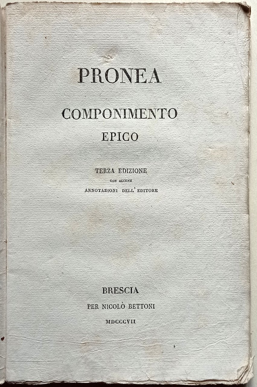 In 8, p. 85 [3], br. orig. muta di colore giallo. - Dedicato a "Napoleone il massimo": «Ma chi potea presagire NAPOLEONE? e come sperarlo? La Provvidenza volle alfine donarlo alla terra…».