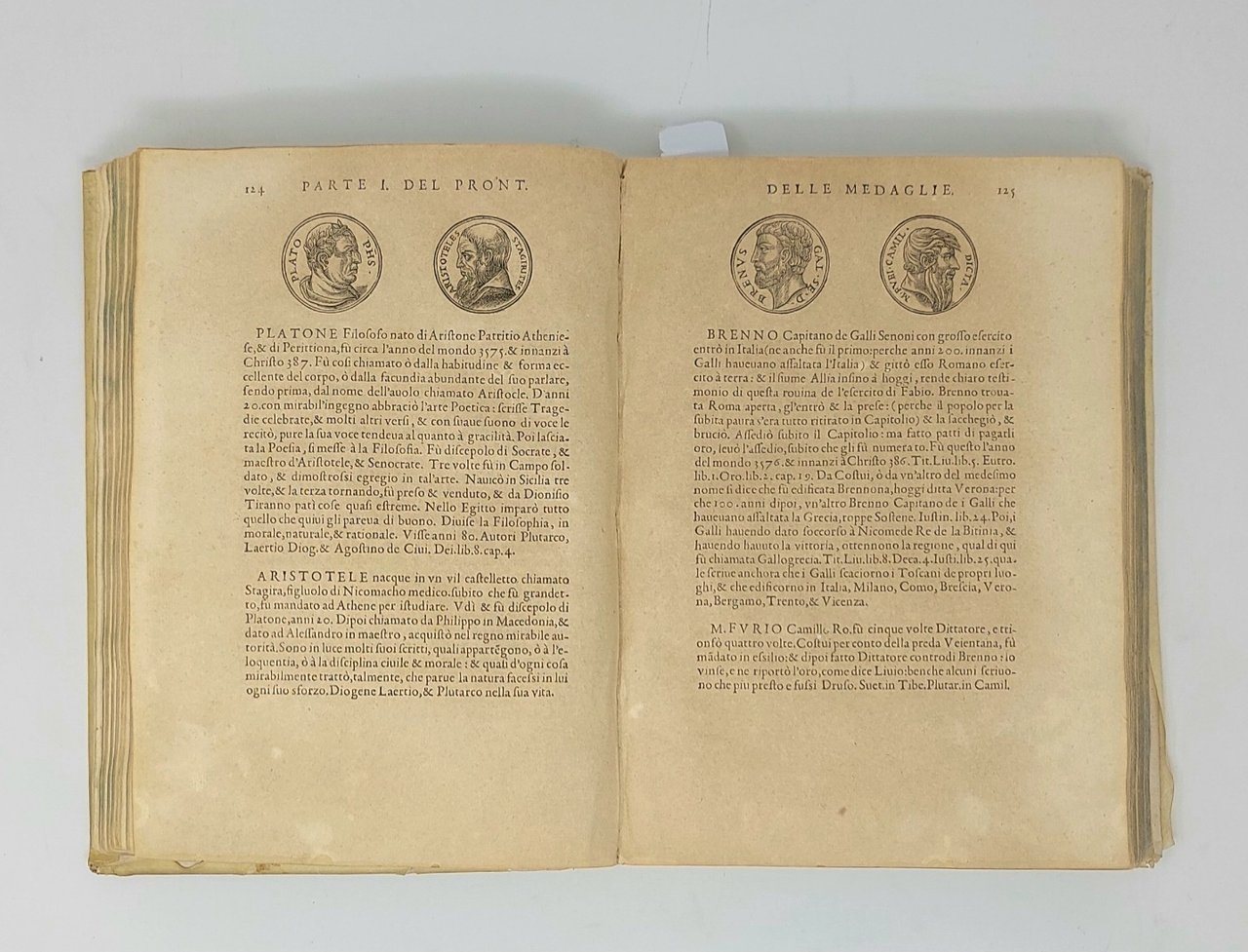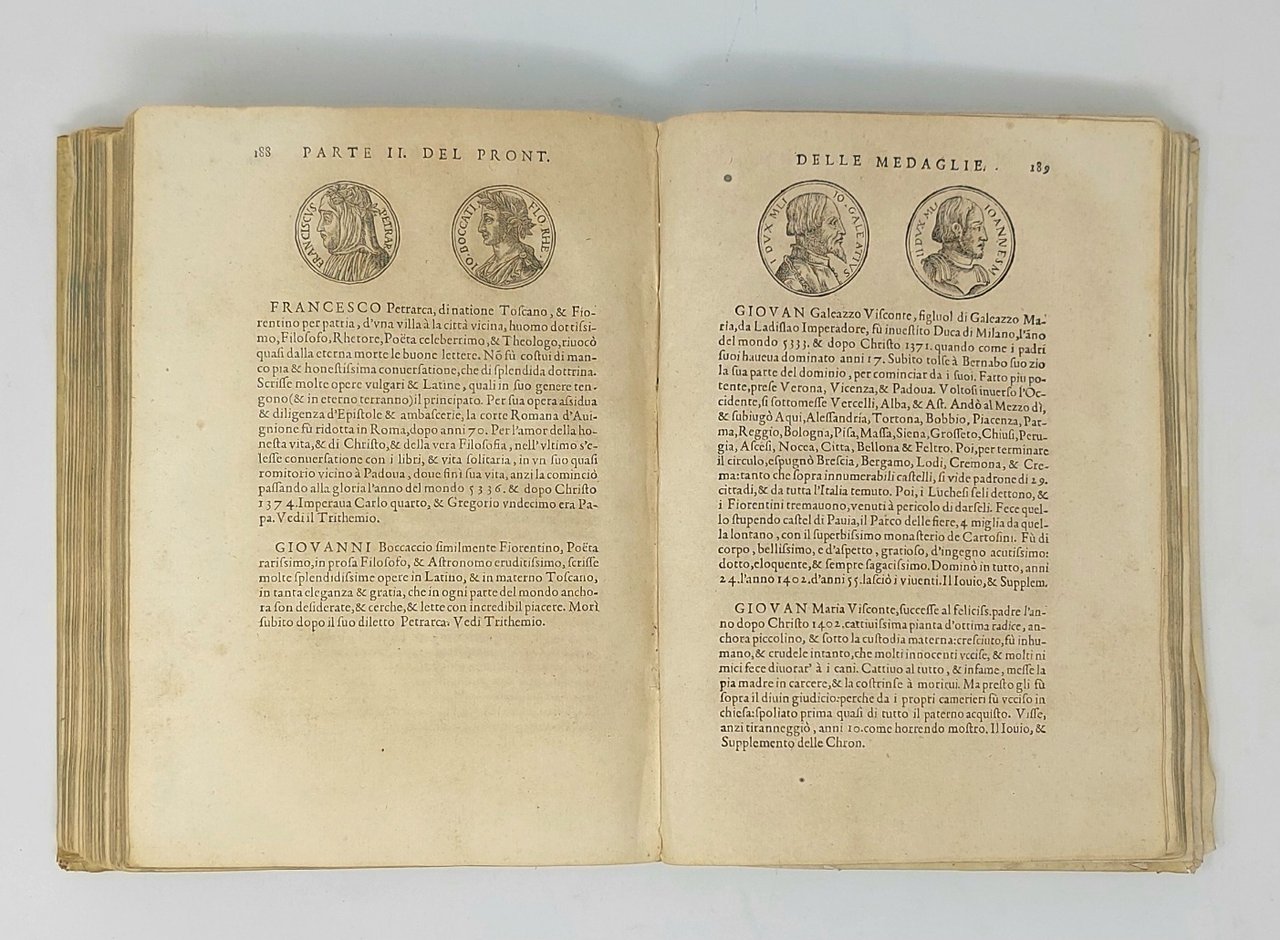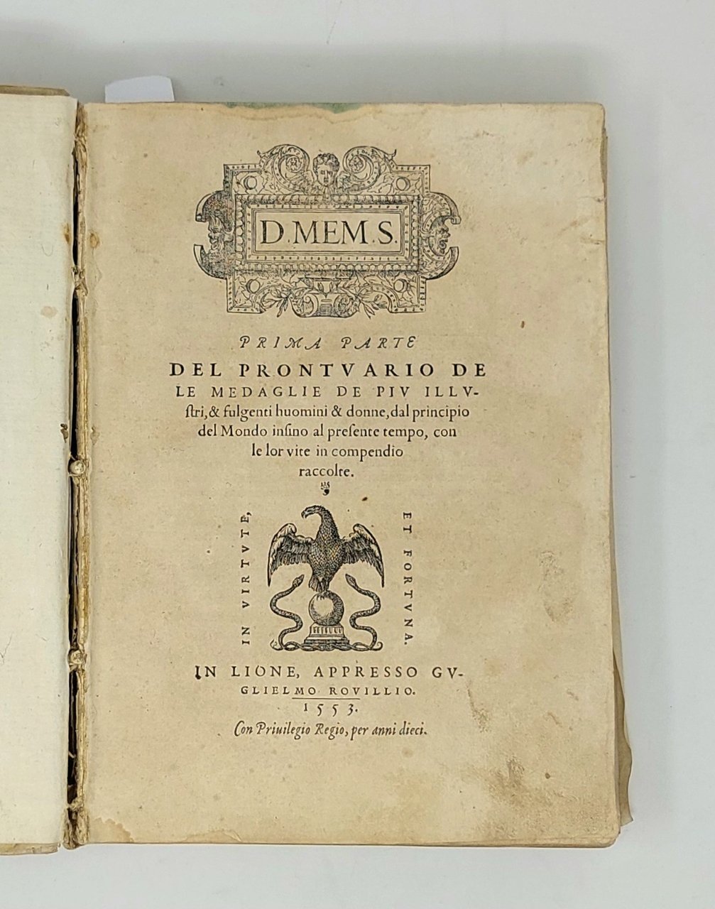 >2 parti in un volume in-8 (238x170 mm), pp. (8: privilegio, dedica a Caterina de' Medici Regina di Francia, lettera ai lettori), 172, (4); 247, (9);  caratteri romano e corsivo, al frontespizio e in fine del vol. 1  "D. Mem. S." in cornice xilografica, iniziali ornate, vignette diverse sui 2 titoli e  824 medaglioni in xilografia.  Legatura in pergamena rigida coeva (con qualche mancanza), titolo manoscritto su tassello cartaceo al dorso. Prima edizione in italiano (fu stampato nello stesso anno anche in latino, francese),  riccamente illustrata con ritratti in xilografia, incisi da vari artisti (cfr. Mortimer), in medaglie (35 mm) che ritraggono figure storiche e mitiche, da Adamo ed Eva ad Enrico II. Il ritratto che apre la seconda parte, Gesù Cristo, è un'ovale più grande con una scena della natività, salvo questa e il ritratto di Enrico II in fine, che sono singoli, ogni pagina reca 2 medaglioni e i corrispondendi paragrafi biografici (fa eccezione aa7v con 3 ritratti). Il nome dell'autore appare nelle epistole dedicatorie, Guillaume Rouillé fu umanista e stampatore che affinò la propria arte a Venezia presso Gabriele Giolito de Ferrari. Superba opera illustrata di grande pregio artistico. Buon esemplare, marginoso, con legni assai nitidi; uniforme ma leggera brunitura della carta, qualche macchia marginale (una sola intacca il ritratto di Domenica in ff5v). Come in altri esemplari, il ritratto di Sala (a8r) è applicato sopra ad un diverso medaglione impresso per errore (ma non quello di Eva). Didot, Essai hist. de la gravure sur bois, col. 245: «Ce livre...est remarquable sous le rapport de l'art. On y voit la gravure sur bois s'efforcer de lutter avec la taille-douce pour rendre le modelé des figures au moyen d'un travail de tailles souvent croisées. La plupart sont très bien exécutèes». Cicognara 2987: «Libro di bella e stimabile esecuzione». Baudrier, IX, 205. Brun, 276. Brunet IV, 900. Adams P 2161.