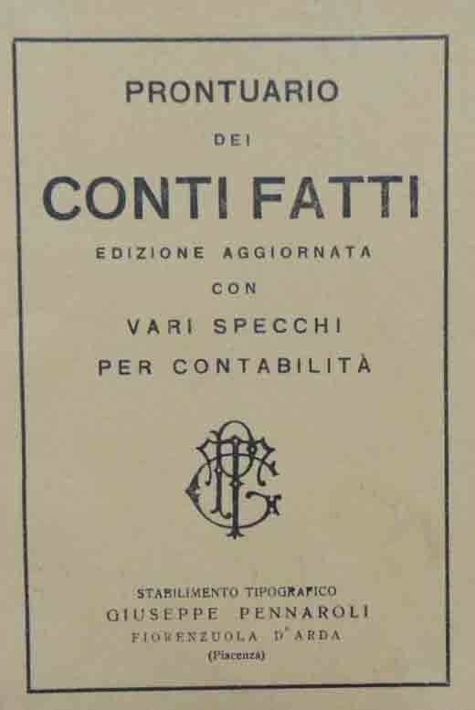 Prontuario dei conti fatti. Edizione aggiornata con vari specchi per contabilità, Tipografia Giuseppe Pennaroli, Fiorenzuola d’Arda (Piacenza) s.d. (1950?), pp. 128, cm 15, br. ed. Leggere tracce d’uso, alcune cifre a biro e pastello appuntate a una carta, minima brunitura della carta, ma nel complesso buona copia.