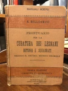 .Opera indispensabile ai negozianti di legnami, intraprenditori di lavori, costruttori navali, falegnami, ebanisti, dilettanti ecc. Terza edizione corretta ed accresciuta. Pagg. 203 + 64 di pubblicitò Hoepli. Leggera gora al margine inf. della prima e dell'ultima carta bianca. Normale brunitura ad alcune pagine, lievi segni d'uso alla copertina ma buon esemplare. Tutta tela edit. Mis mm 150x100