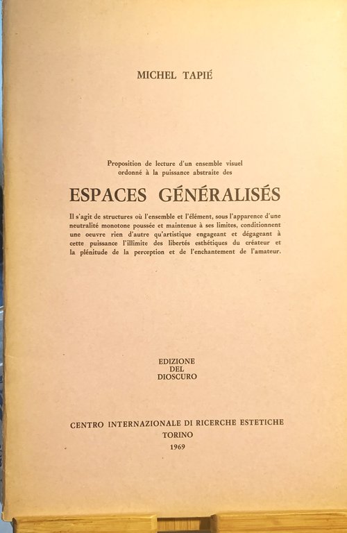 I ed. (15 janvier 1969): "Cet ouvrage (...) a été en plus tiré à cinq cent exemplaires pour les artistes reproduits et la presse d'art". III quaderno dell' "Introduction à la connaissance esthétique". Testo in francese. Sottotitolo: "Il s'agit de structures où l'ensemble et l'élément, sous l'apparence d'une neutralité monotone poussée et maintenue à ses limites, conditionnent une oeuvre rien d'autre qu'artistique engageant et dégageant à cette puissance l'illimite des libertés esthétiques du créateur et la plénitude de la perception et de l'enchantement de l'amateur". IV/28/brossura in cartoncino liscio rosatofermato al dorso con due punti metallicei, con titoli in nero e in quarta di copertina riproduzione in nero di un bijou originale di Ada Minola (coll. Centre d'Esthétique). Illustrazioni in b/n. Stato buono. Table des matières: Espaces généralisés; M. T. - Bibliographie (1952-en préparation).