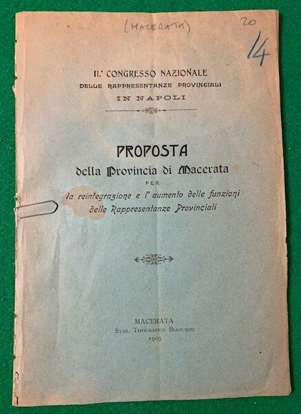 In 4°; 16 pp. Brossura editoriale, conservato solo il piatto anteriore. Prima ed unica edizione di questo scritto dedicato alle funzioni di Rappresentanze Provinciali. Qualche lieve segno del tempo ma in buone condizioni di conservazioni.