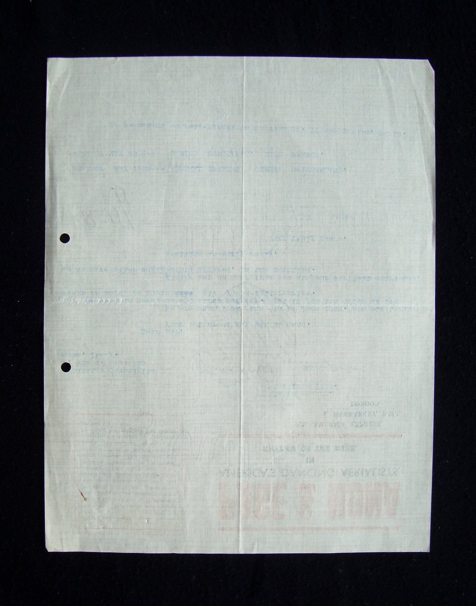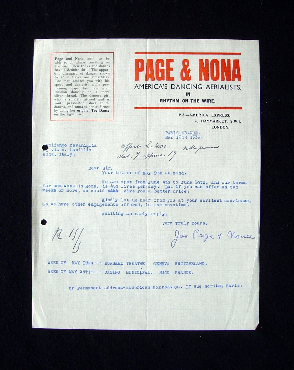 Lettera, Page & Nona America's Dancing Aerialists in Rhythm on the wire lettera dattiloscritta datata Paris France May 12th 1939 Lettera su carta con intestazione a stampa, datata Paris France May 12 th 1939. Cm 27,5x21,5. Testo in inglese. Condizioni di conservazione Esemplare ben conservato con tracce d'uso e del tempo, pieghe di spedizione; un margne esterno con un paio di forellini per archiviazione; margini con minuscoli trascurabili difetti. SC03.D16548 blu