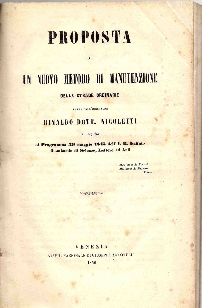 Proposta di un nuovo metodo di manutenzione delle strade ordinarie in seguito al Programma 30 maggio 1845 dell'I. R. Istituto Lombardo di Scienze, Lettere ed Arti